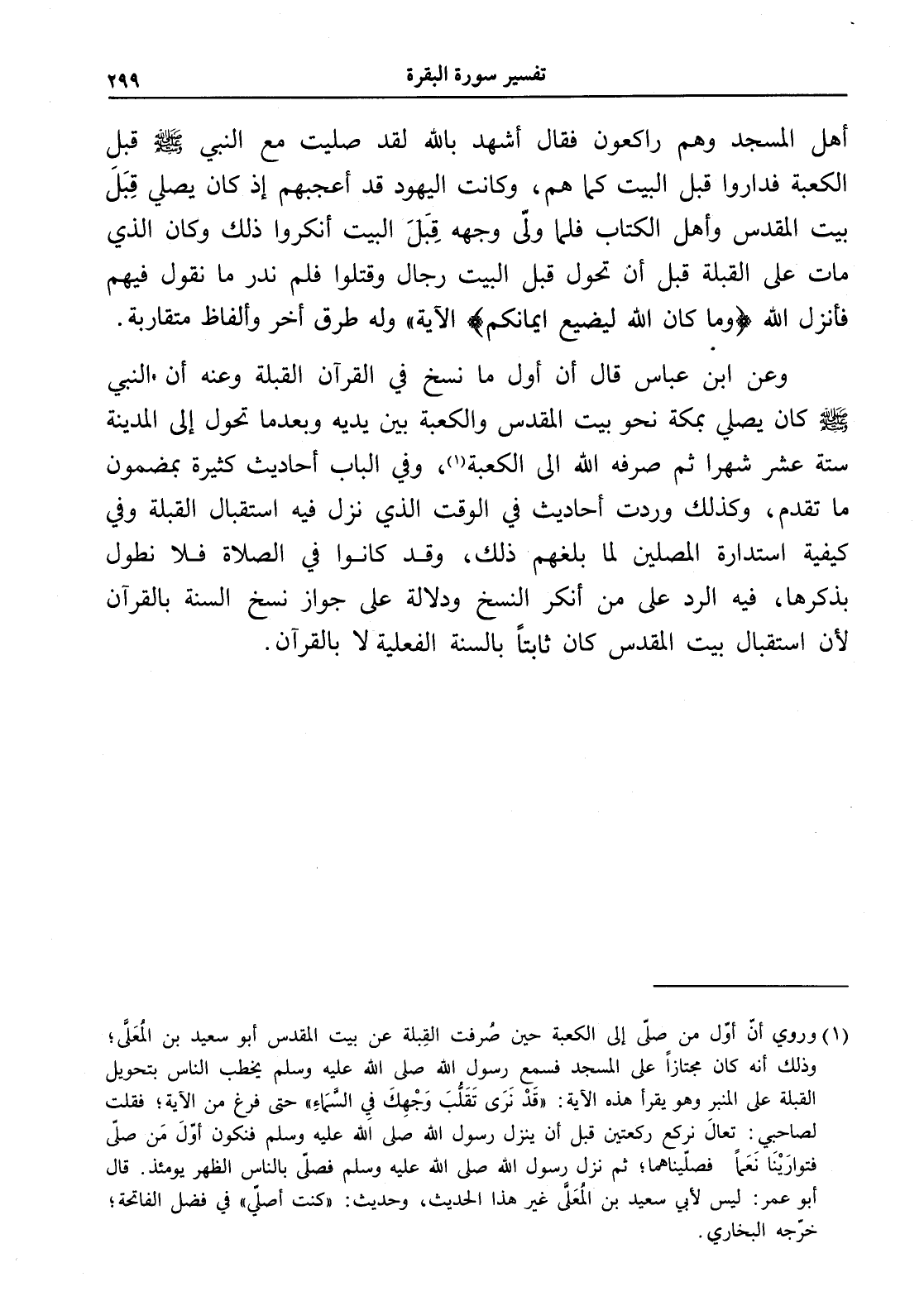 وعن ابن عباس قال أن أول ما نسخ في القرآن القبلة وعنه أن النبي - صلى الله عليه وسلم - كان يصلي بمكة نحو بيت المقدس والكعبة بين يديه وبعدما تحول إلى المدينة ستة عشر شهراً ثم صرفه الله إلى الكعبة (¬1)، وفي الباب أحاديث كثيرة بمضمون ما تقدم، وكذلك وردت أحاديث في الوقت الذي نزل فيه استقبال القبلة وفي كيفية استدارة المصلين لما بلغهم ذلك، وقد كانوا في الصلاة فلا نطول بذكرها، فيه الرد على من أنكر النسخ ودلالة على جواز نسخ السنة بالقرآن لأن استقبال بيت المقدس كان ثابتاً بالسنة الفعلية لا بالقرآن.