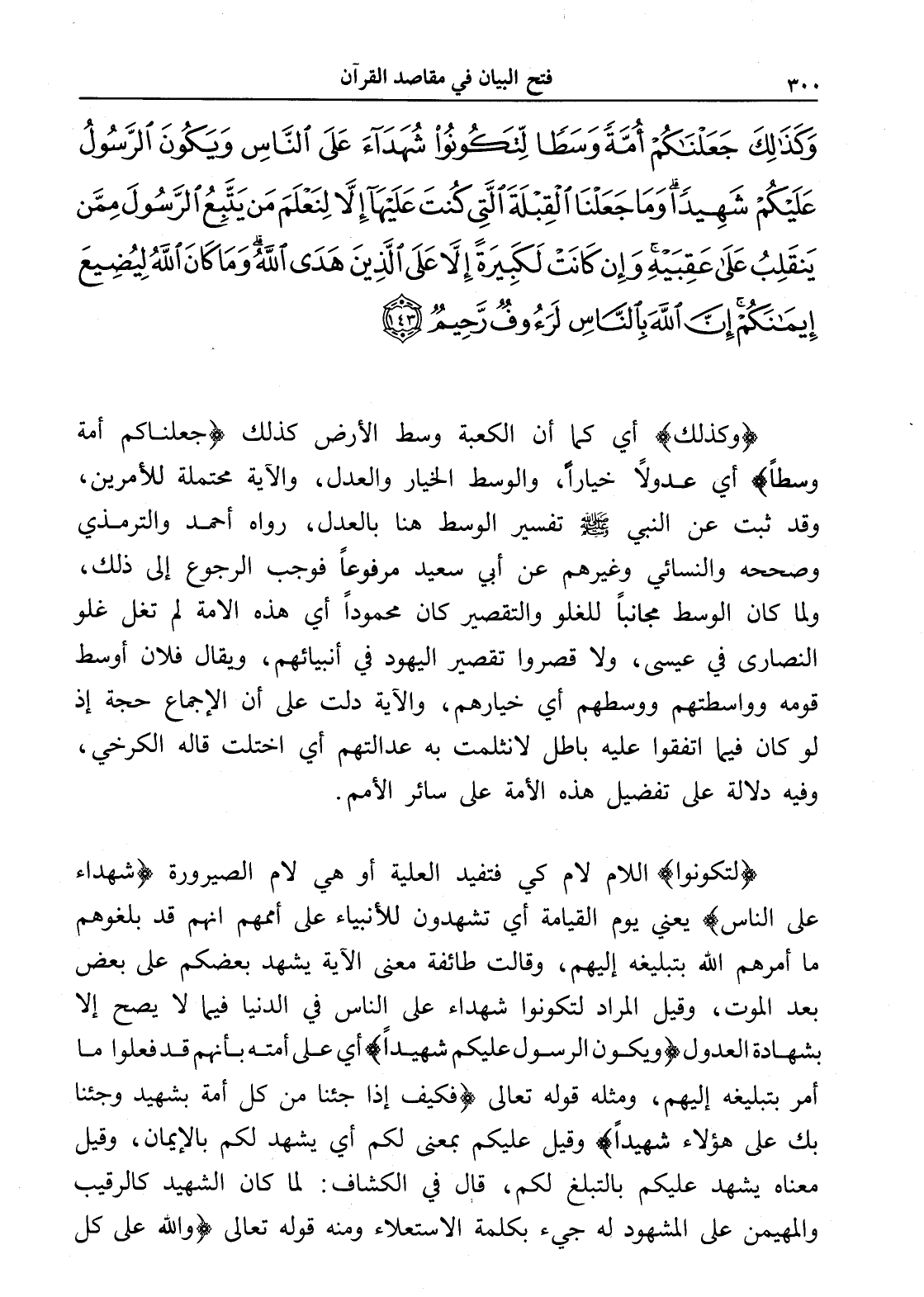 وَكَذَلِكَ جَعَلْنَاكُمْ أُمَّةً وَسَطًا لِتَكُونُوا شُهَدَاءَ عَلَى النَّاسِ وَيَكُونَ الرَّسُولُ عَلَيْكُمْ شَهِيدًا وَمَا جَعَلْنَا الْقِبْلَةَ الَّتِي كُنْتَ عَلَيْهَا إِلَّا لِنَعْلَمَ مَنْ يَتَّبِعُ الرَّسُولَ مِمَّنْ يَنْقَلِبُ عَلَى عَقِبَيْهِ وَإِنْ كَانَتْ لَكَبِيرَةً إِلَّا عَلَى الَّذِينَ هَدَى اللَّهُ وَمَا كَانَ اللَّهُ لِيُضِيعَ إِيمَانَكُمْ إِنَّ اللَّهَ بِالنَّاسِ لَرَءُوفٌ رَحِيمٌ (143)