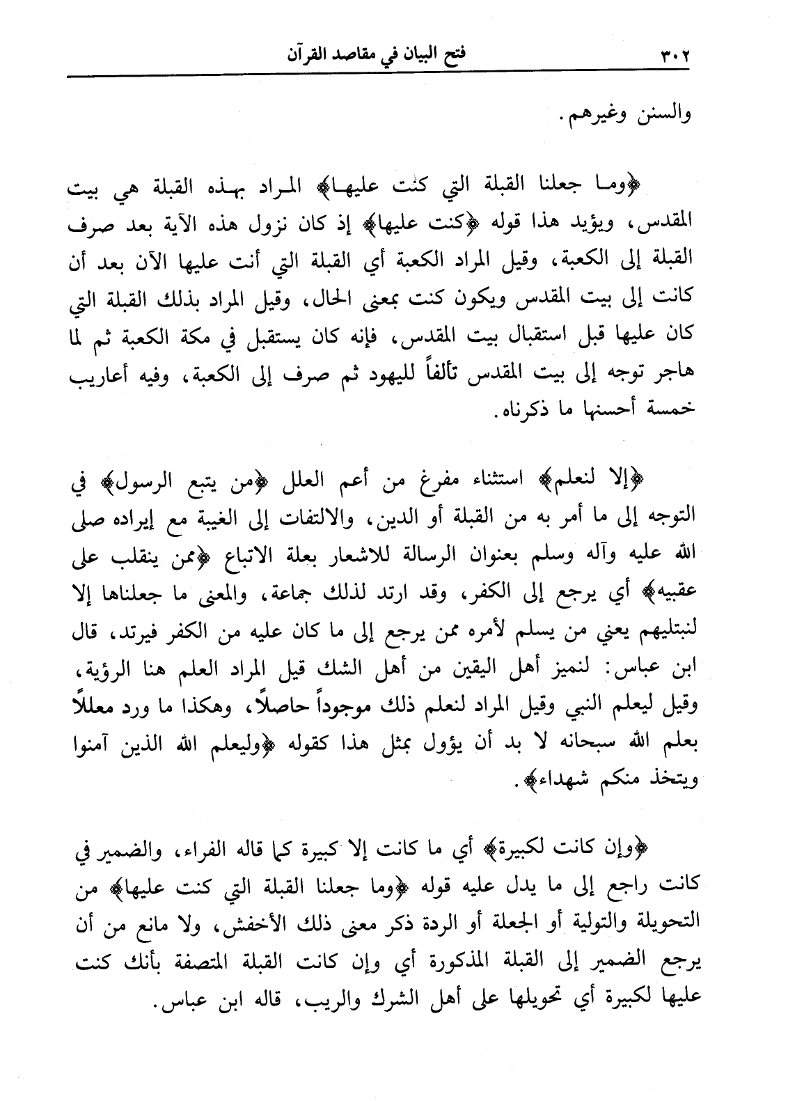 (وما جعلنا القبلة التي كنت عليها) المراد بهذه القبلة هي بيت المقدس، ويؤيد هذا قوله (كنت عليها) إذ كان نزول هذه الآية بعد صرف القبلة إلى الكعبة، وقيل المراد الكعبة أي القبلة التي أنت عليها الآن بعد أن كانت إلى بيت المقدس ويكون كنت بمعنى الحال، وقيل المراد بذلك القبلة التي كان عليها قبل استقبال بيت المقدس، فإنه كان يستقبل في مكة الكعبة ثم لما هاجر توجه إلى بيت المقدس تالفاً لليهود ثم صرف إلى الكعبة، وفيه أعاريب خمسة أحسنها ما ذكرناه.