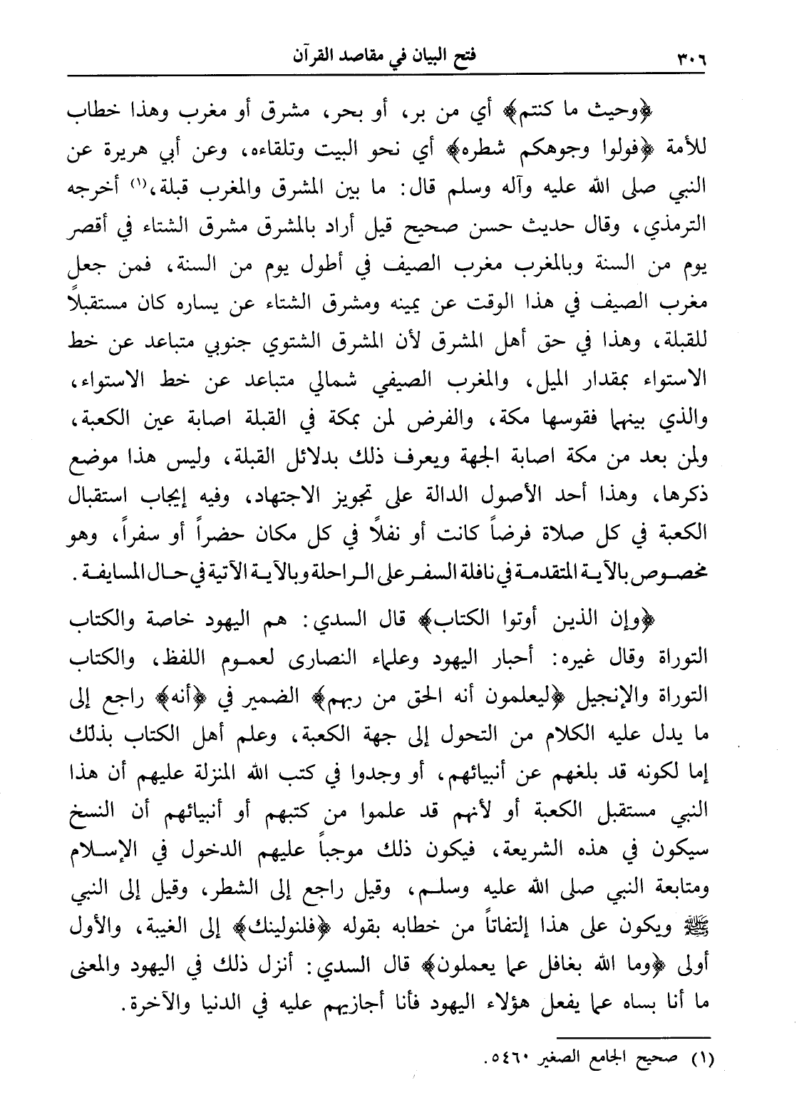 (وحيث ما كنتم) أي من بر، أو بحر، مشرق أو مغرب وهذا خطاب للأمة (فولوا وجوهكم شطره) أي نحو البيت وتلقاءه، وعن أبي هريرة عن النبي صلى الله عليه وآله وسلم قال: ما بين المشرق والمغرب قبلة، (¬1) أخرجه الترمذي، وقال حديث حسن صحيح قيل أراد بالمشرق مشرق الشتاء في أقصر يوم من السنة وبالمغرب مغرب الصيف في أطول يوم من السنة، فمن جعل مغرب الصيف في هذا الوقت عن يمينه ومشرق الشتاء عن يساره كان مستقبلاً للقبلة، وهذا في حق أهل المشرق لأن المشرق الشتوي جنوبي متباعد عن خط الاستواء بمقدار الميل، والمغرب الصيفي شمالي متباعد عن خط الاستواء، والذي بينهما فقوسها مكة، والفرض لمن بمكة في القبلة إصابة عين الكعبة، ولمن بعد من مكة إصابة الجهة ويعرف ذلك بدلائل القبلة، وليس هذا موضع ذكرها، وهذا أحد الأصول الدالة على تجويز الاجتهاد، وفيه إيجاب استقبال الكعبة في كل صلاة فرضاً كانت أو نفلاً في كل مكان حضراً أو سفراً، وهو مخصوص بالآية التقدمة في نافلة السفر على الراحلة وبالآية الآتية في حال المسايفة.