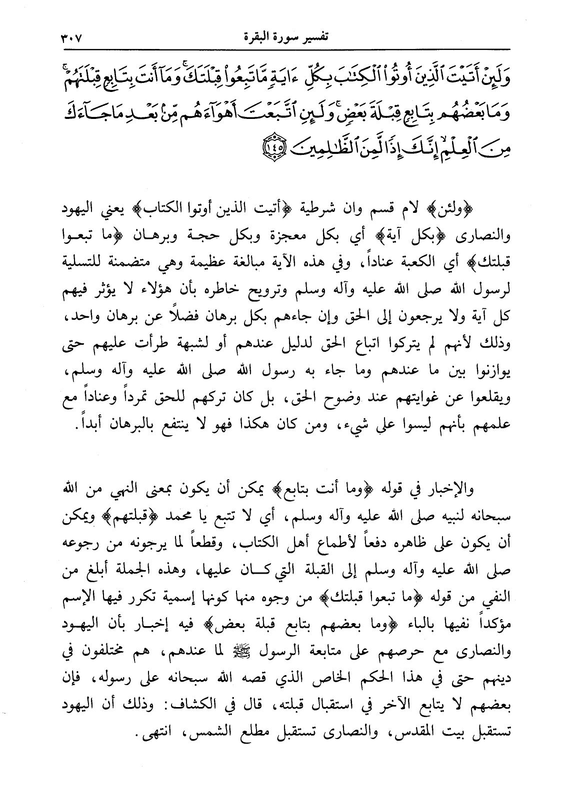 وَلَئِنْ أَتَيْتَ الَّذِينَ أُوتُوا الْكِتَابَ بِكُلِّ آَيَةٍ مَا تَبِعُوا قِبْلَتَكَ وَمَا أَنْتَ بِتَابِعٍ قِبْلَتَهُمْ وَمَا بَعْضُهُمْ بِتَابِعٍ قِبْلَةَ بَعْضٍ وَلَئِنِ اتَّبَعْتَ أَهْوَاءَهُمْ مِنْ بَعْدِ مَا جَاءَكَ مِنَ الْعِلْمِ إِنَّكَ إِذًا لَمِنَ الظَّالِمِينَ (145)