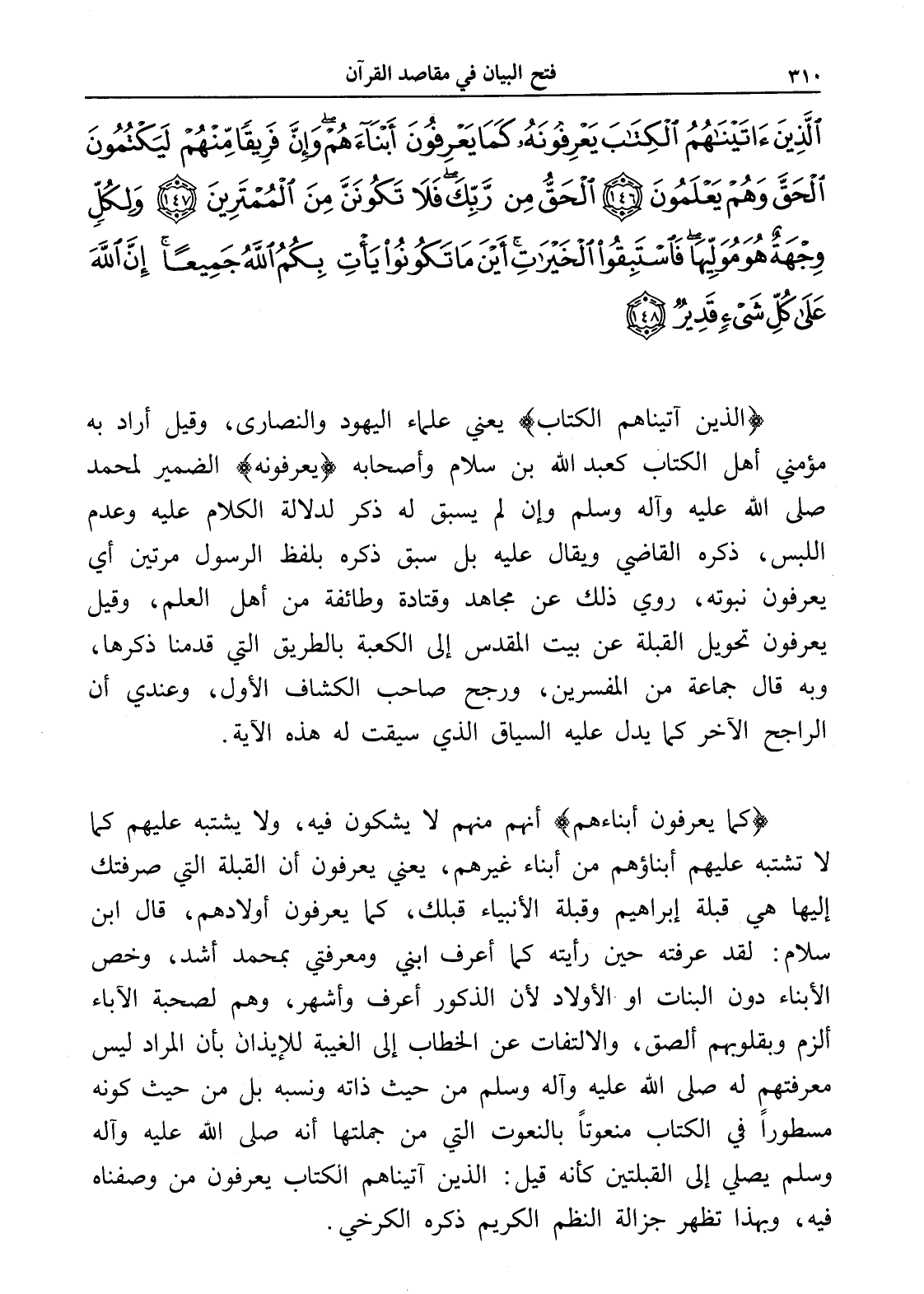 الَّذِينَ آَتَيْنَاهُمُ الْكِتَابَ يَعْرِفُونَهُ كَمَا يَعْرِفُونَ أَبْنَاءَهُمْ وَإِنَّ فَرِيقًا مِنْهُمْ لَيَكْتُمُونَ الْحَقَّ وَهُمْ يَعْلَمُونَ (146) الْحَقُّ مِنْ رَبِّكَ فَلَا تَكُونَنَّ مِنَ الْمُمْتَرِينَ (147) وَلِكُلٍّ وِجْهَةٌ هُوَ مُوَلِّيهَا فَاسْتَبِقُوا الْخَيْرَاتِ أَيْنَ مَا تَكُونُوا يَأْتِ بِكُمُ اللَّهُ جَمِيعًا إِنَّ اللَّهَ عَلَى كُلِّ شَيْءٍ قَدِيرٌ (148)