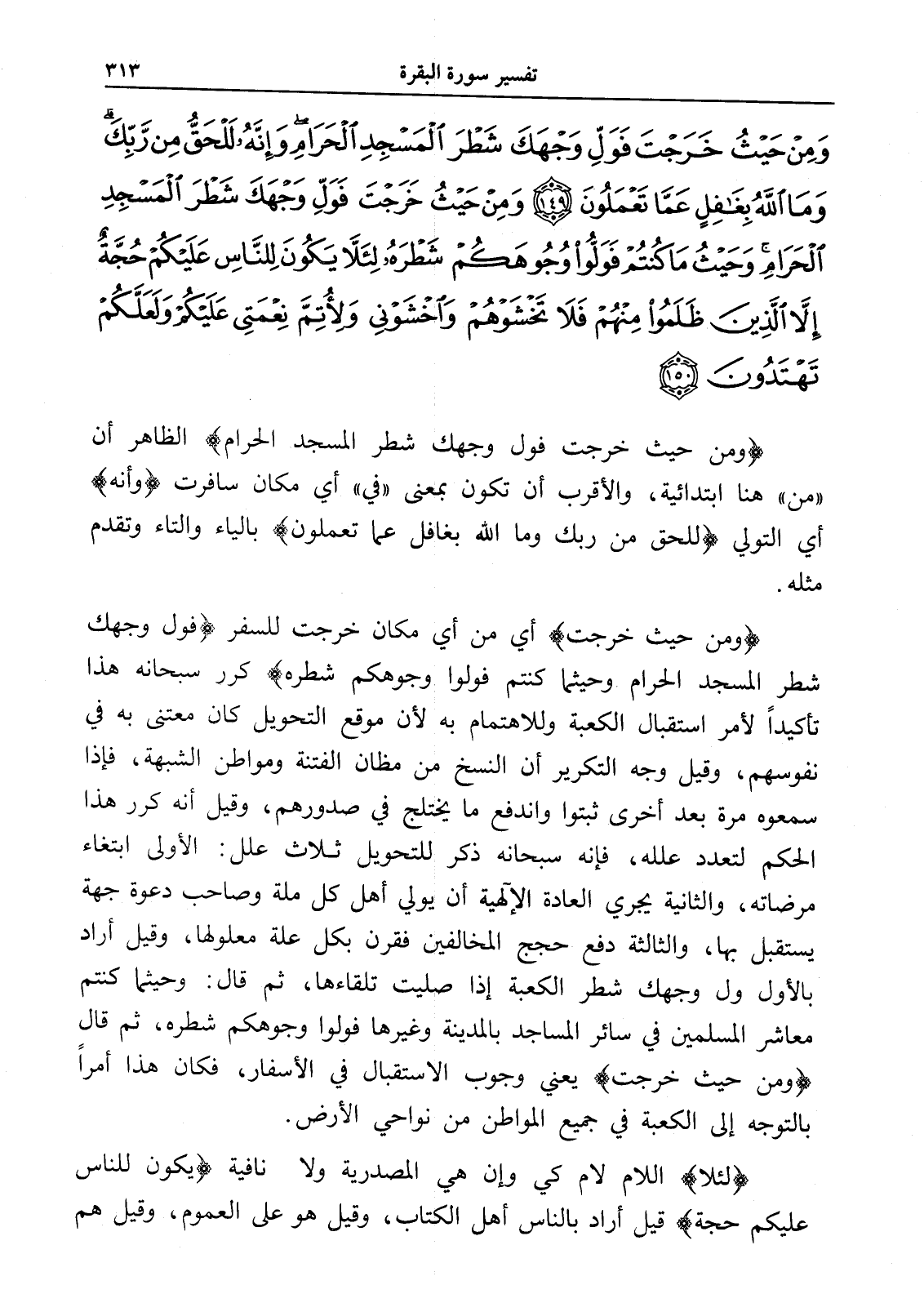 وَمِنْ حَيْثُ خَرَجْتَ فَوَلِّ وَجْهَكَ شَطْرَ الْمَسْجِدِ الْحَرَامِ وَإِنَّهُ لَلْحَقُّ مِنْ رَبِّكَ وَمَا اللَّهُ بِغَافِلٍ عَمَّا تَعْمَلُونَ (149) وَمِنْ حَيْثُ خَرَجْتَ فَوَلِّ وَجْهَكَ شَطْرَ الْمَسْجِدِ الْحَرَامِ وَحَيْثُ مَا كُنْتُمْ فَوَلُّوا وُجُوهَكُمْ شَطْرَهُ لِئَلَّا يَكُونَ لِلنَّاسِ عَلَيْكُمْ حُجَّةٌ إِلَّا الَّذِينَ ظَلَمُوا مِنْهُمْ فَلَا تَخْشَوْهُمْ وَاخْشَوْنِي وَلِأُتِمَّ نِعْمَتِي عَلَيْكُمْ وَلَعَلَّكُمْ تَهْتَدُونَ (150)