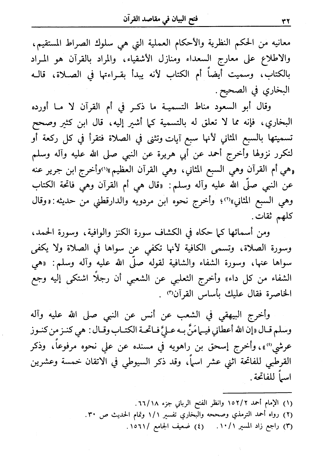معانيه من الحكم النظرية والأحكام العملية التي هي سلوك الصراط المستقيم، والاطلاع على معارج السعداء ومنازل الأشقياء، والمراد بالقرآن هو المراد بالكتاب، وسميت أيضاً أم الكتاب لأنه يبدأ بقراءتها في الصلاة، قاله البخاري في الصحيح.
