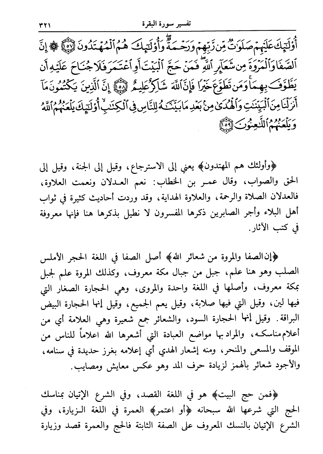 أُولَئِكَ عَلَيْهِمْ صَلَوَاتٌ مِنْ رَبِّهِمْ وَرَحْمَةٌ وَأُولَئِكَ هُمُ الْمُهْتَدُونَ (157) إِنَّ الصَّفَا وَالْمَرْوَةَ مِنْ شَعَائِرِ اللَّهِ فَمَنْ حَجَّ الْبَيْتَ أَوِ اعْتَمَرَ فَلَا جُنَاحَ عَلَيْهِ أَنْ يَطَّوَّفَ بِهِمَا وَمَنْ تَطَوَّعَ خَيْرًا فَإِنَّ اللَّهَ شَاكِرٌ عَلِيمٌ (158) إِنَّ الَّذِينَ يَكْتُمُونَ مَا أَنْزَلْنَا مِنَ الْبَيِّنَاتِ وَالْهُدَى مِنْ بَعْدِ مَا بَيَّنَّاهُ لِلنَّاسِ فِي الْكِتَابِ أُولَئِكَ يَلْعَنُهُمُ اللَّهُ وَيَلْعَنُهُمُ اللَّاعِنُونَ (159)