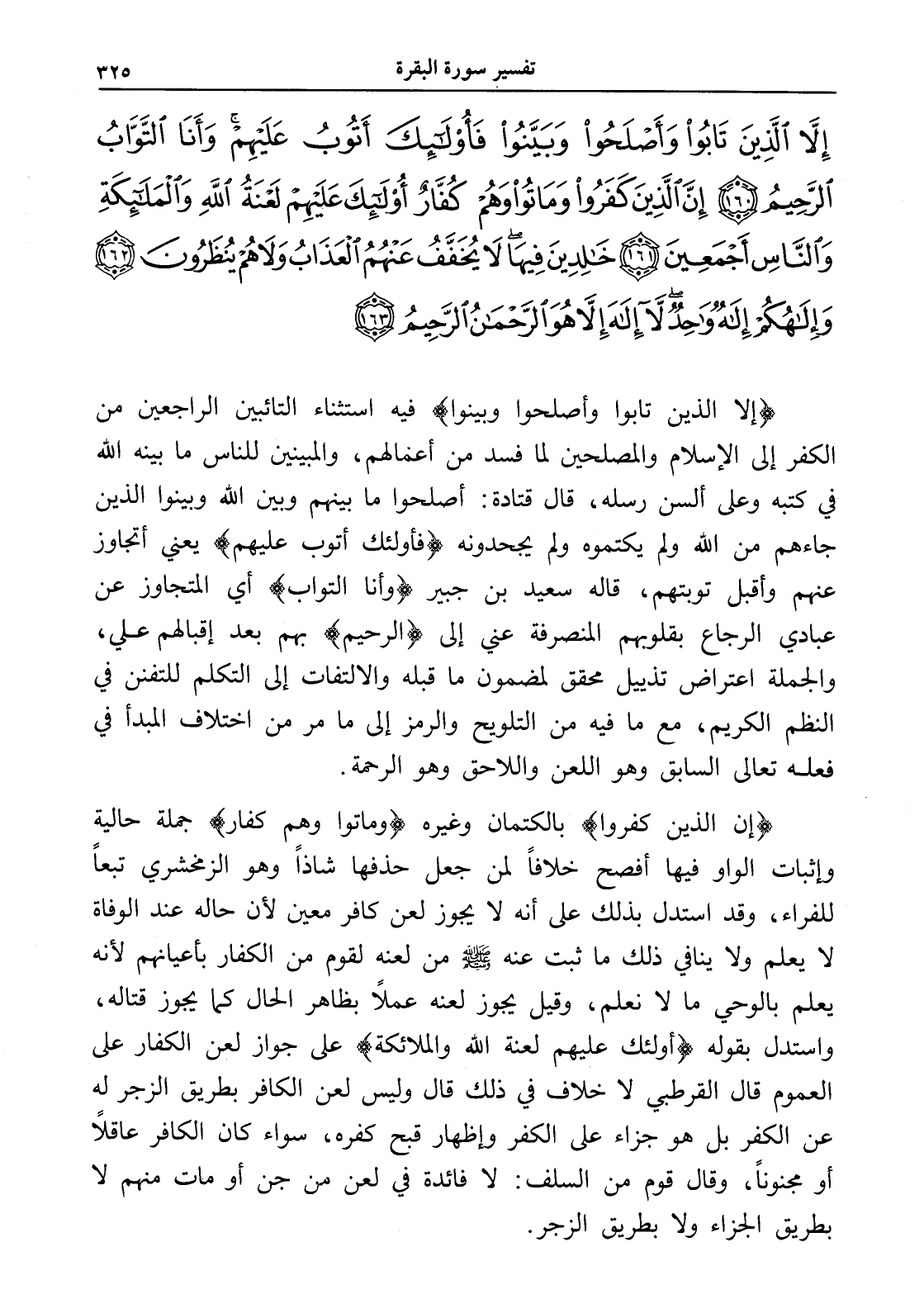 إِلَّا الَّذِينَ تَابُوا وَأَصْلَحُوا وَبَيَّنُوا فَأُولَئِكَ أَتُوبُ عَلَيْهِمْ وَأَنَا التَّوَّابُ الرَّحِيمُ (160) إِنَّ الَّذِينَ كَفَرُوا وَمَاتُوا وَهُمْ كُفَّارٌ أُولَئِكَ عَلَيْهِمْ لَعْنَةُ اللَّهِ وَالْمَلَائِكَةِ وَالنَّاسِ أَجْمَعِينَ (161) خَالِدِينَ فِيهَا لَا يُخَفَّفُ عَنْهُمُ الْعَذَابُ وَلَا هُمْ يُنْظَرُونَ (162) وَإِلَهُكُمْ إِلَهٌ وَاحِدٌ لَا إِلَهَ إِلَّا هُوَ الرَّحْمَنُ الرَّحِيمُ (163)