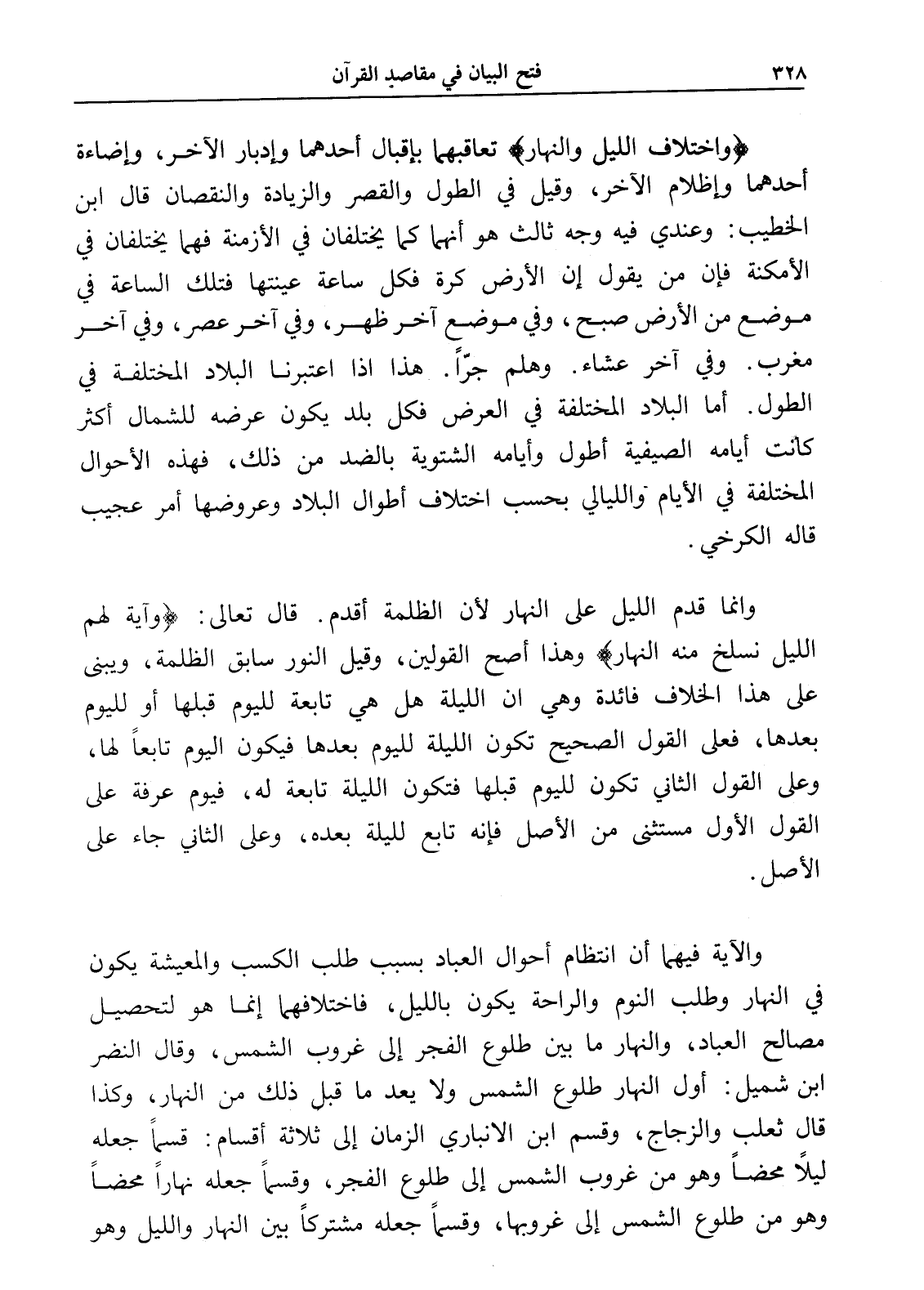 والآية فيهما أن انتظام أحوال العباد بسبب طلب الكسب والمعيشة يكون في النهار وطلب النوم والراحة يكون بالليل، فاختلافهما إنما هو لتحصيل مصالح العباد، والنهار ما بين طلوع الفجر إلى غروب الشمس، وقال النضر ابن شميل: أول النهار طلوع الشمس ولا يعد ما قبل ذلك من النهار، وكذا قال ثعلب والزجاج، وقسم ابن الأنباري الزمان إلى ثلاثة أقسام: قسماً جعله ليلاً محضاً وهو من غروب الشمس إلى طلوع الفجر، وقسماً جعله نهاراً محضاً وهو من طلوع الشمس إلى غروبها، وقسماً جعله مشتركاً بين النهار والليل وهو