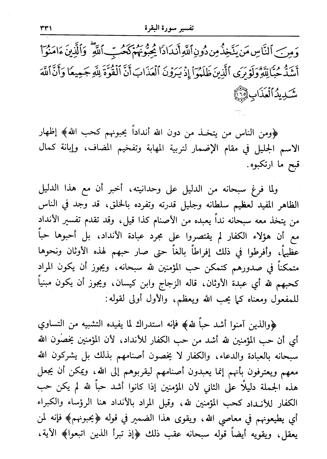 وَمِنَ النَّاسِ مَنْ يَتَّخِذُ مِنْ دُونِ اللَّهِ أَنْدَادًا يُحِبُّونَهُمْ كَحُبِّ اللَّهِ وَالَّذِينَ آَمَنُوا أَشَدُّ حُبًّا لِلَّهِ وَلَوْ يَرَى الَّذِينَ ظَلَمُوا إِذْ يَرَوْنَ الْعَذَابَ أَنَّ الْقُوَّةَ لِلَّهِ جَمِيعًا وَأَنَّ اللَّهَ شَدِيدُ الْعَذَابِ (165)