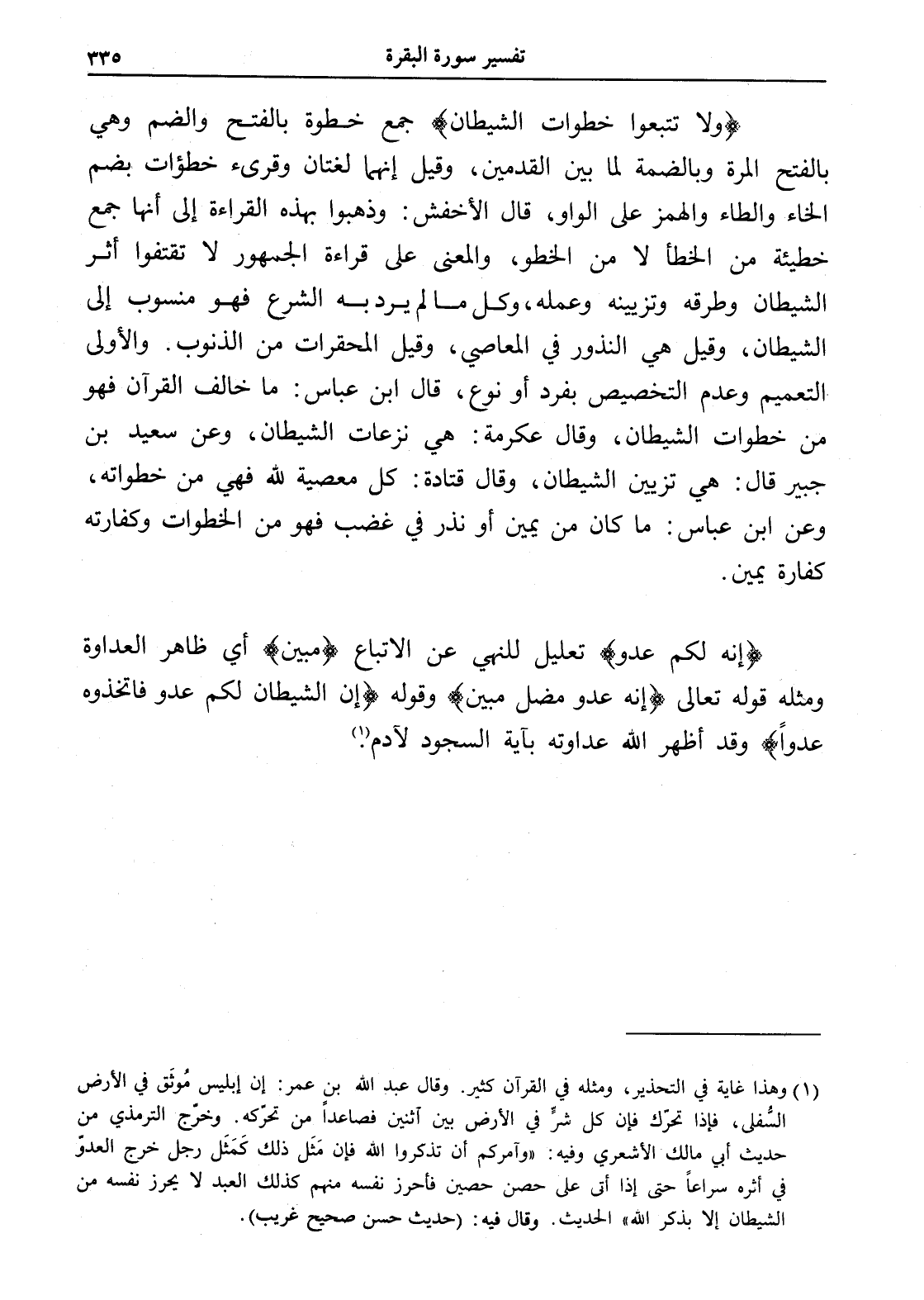 (ولا تتبعوا خطوات الشيطان) جمع خطوة بالفتح والضم وهي بالفتح المرة وبالضمة لما بين القدمين، وقيل إنهما لغتان وقرىء خطؤات، بضم الخاء والطاء والهمز على الواو، قال الأخفش: وذهبوا بهذه القراءة إلى أنها جمع خطيئة من الخطأ لا من الخطو، والمعنى على قراءة الجمهور لا تقتفوا أثر الشيطان وطرقه وتزيينه وعمله، وكل ما لم يرد به الشرع فهو منسوب إلى الشيطان، وقيل هي النذور في المعاصي، وقيل المحقرات من الذنوب. والأولى التعميم وعدم التخصيص بفرد أو نوع، قال ابن عباس: ما خالف القرآن فهو من خطوات الشيطان، وقال عكرمة: هي نزعات الشيطان، وعن سعيد بن جبير قال: هي تزيين الشيطان، وقال قتادة: كل معصية لله فهي من خطواته، وعن ابن عباس: ما كان من يمين أو نذر في غضب فهو من الخطوات وكفارته كفارة يمين.
