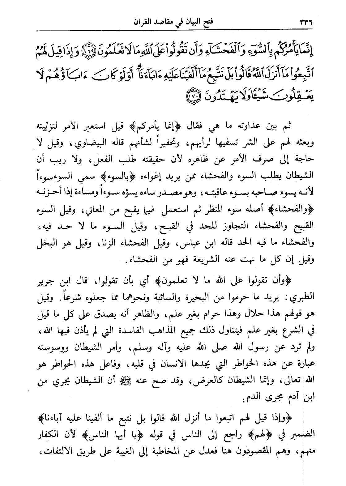 إِنَّمَا يَأْمُرُكُمْ بِالسُّوءِ وَالْفَحْشَاءِ وَأَنْ تَقُولُوا عَلَى اللَّهِ مَا لَا تَعْلَمُونَ (169) وَإِذَا قِيلَ لَهُمُ اتَّبِعُوا مَا أَنْزَلَ اللَّهُ قَالُوا بَلْ نَتَّبِعُ مَا أَلْفَيْنَا عَلَيْهِ آَبَاءَنَا أَوَلَوْ كَانَ آَبَاؤُهُمْ لَا يَعْقِلُونَ شَيْئًا وَلَا يَهْتَدُونَ (170)