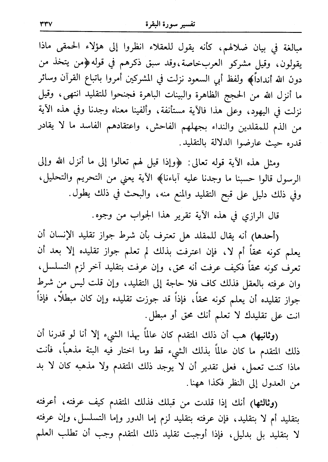 (وثالثها) أنك إذا قلدت من قبلك فذلك المتقدم كيف عرفته، أعرفته بتقليد أم لا بتقليد، فإن عرفته بتقليد لزم إما الدور وإما التسلسل، وإن عرفته لا بتقليد بل بدليل، فإذا أوجبت تقليد ذلك المتقدم وجب أن تطلب العلم