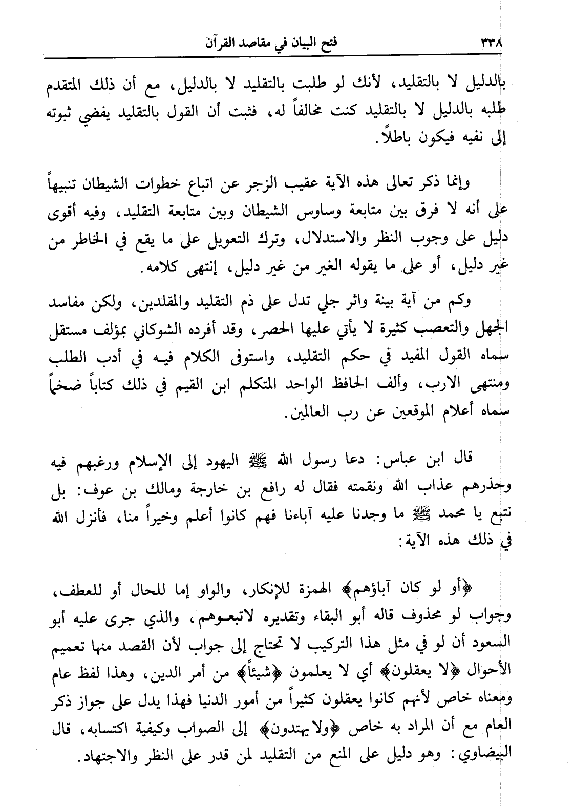 وإنما ذكر تعالى هذه الآية عقيب الزجر عن اتباع خطوات الشيطان تنبيهاً على أنه لا فرق بين متابعة وساوس الشيطان وبين متابعة التقليد، وفيه أقوى دليل على وجوب النظر والاستدلال، وترك التعويل على ما يقع في الخاطر من غير دليل، أو على ما يقوله الغير من غير دليل، انتهى كلامه.