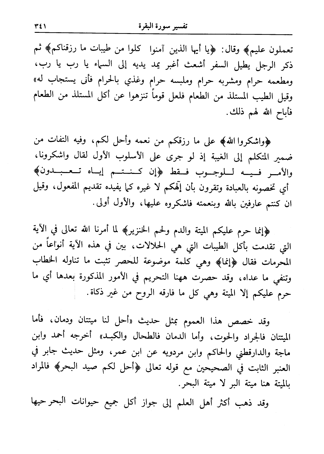 وقد خصص هذا العموم بمثل حديث " أحل لنا ميتتان ودمان، فأما الميتتان فالجراد والحوت، وأما الدمان فالطحال والكبد " أخرجه أحمد وابن ماجة والدارقطني والحاكم وابن مردويه عن ابن عمر، ومثل حديث جابر في العنبر الثابت في الصحيحين مع قوله تعالى (أحل لكم صيد البحر) فالمراد بالميتة هنا ميتة البر لا ميتة البحر.