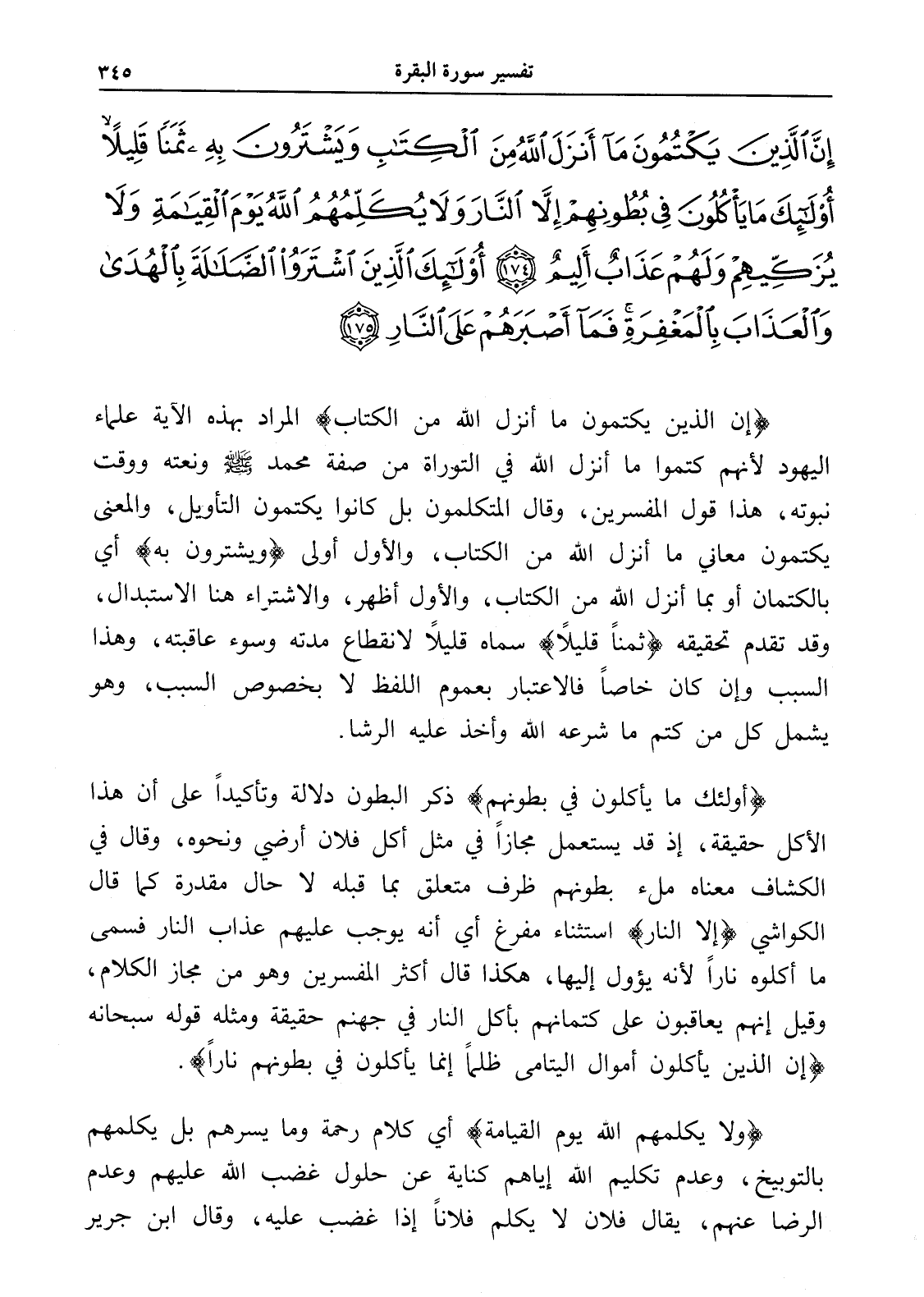 إِنَّ الَّذِينَ يَكْتُمُونَ مَا أَنْزَلَ اللَّهُ مِنَ الْكِتَابِ وَيَشْتَرُونَ بِهِ ثَمَنًا قَلِيلاً أُولَئِكَ مَا يَأْكُلُونَ فِي بُطُونِهِمْ إِلَّا النَّارَ وَلَا يُكَلِّمُهُمُ اللَّهُ يَوْمَ الْقِيَامَةِ وَلَا يُزَكِّيهِمْ وَلَهُمْ عَذَابٌ أَلِيمٌ (174) أُولَئِكَ الَّذِينَ اشْتَرَوُا الضَّلَالَةَ بِالْهُدَى وَالْعَذَابَ بِالْمَغْفِرَةِ فَمَا أَصْبَرَهُمْ عَلَى النَّارِ (175)