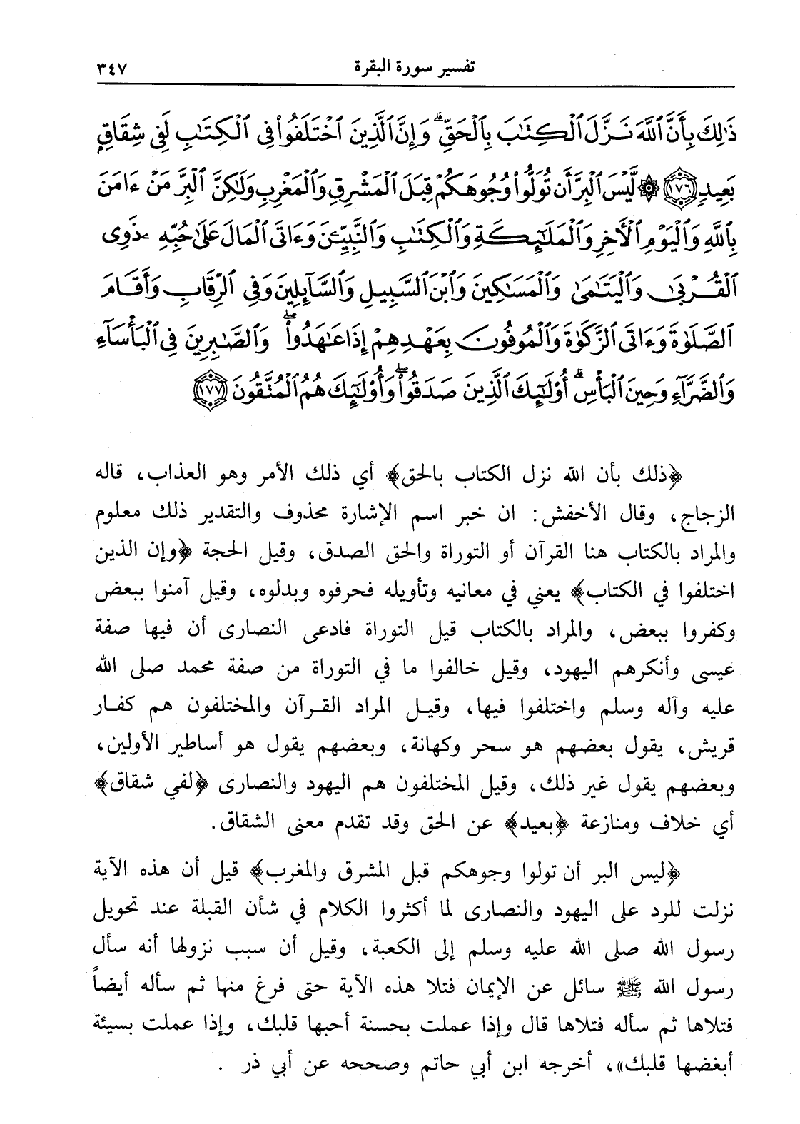 ذَلِكَ بِأَنَّ اللَّهَ نَزَّلَ الْكِتَابَ بِالْحَقِّ وَإِنَّ الَّذِينَ اخْتَلَفُوا فِي الْكِتَابِ لَفِي شِقَاقٍ بَعِيدٍ (176) لَيْسَ الْبِرَّ أَنْ تُوَلُّوا وُجُوهَكُمْ قِبَلَ الْمَشْرِقِ وَالْمَغْرِبِ وَلَكِنَّ الْبِرَّ مَنْ آَمَنَ بِاللَّهِ وَالْيَوْمِ الْآَخِرِ وَالْمَلَائِكَةِ وَالْكِتَابِ وَالنَّبِيِّينَ وَآَتَى الْمَالَ عَلَى حُبِّهِ ذَوِي الْقُرْبَى وَالْيَتَامَى وَالْمَسَاكِينَ وَابْنَ السَّبِيلِ وَالسَّائِلِينَ وَفِي الرِّقَابِ وَأَقَامَ الصَّلَاةَ وَآَتَى الزَّكَاةَ وَالْمُوفُونَ بِعَهْدِهِمْ إِذَا عَاهَدُوا وَالصَّابِرِينَ فِي الْبَأْسَاءِ وَالضَّرَّاءِ وَحِينَ الْبَأْسِ أُولَئِكَ الَّذِينَ صَدَقُوا وَأُولَئِكَ هُمُ الْمُتَّقُونَ (177)