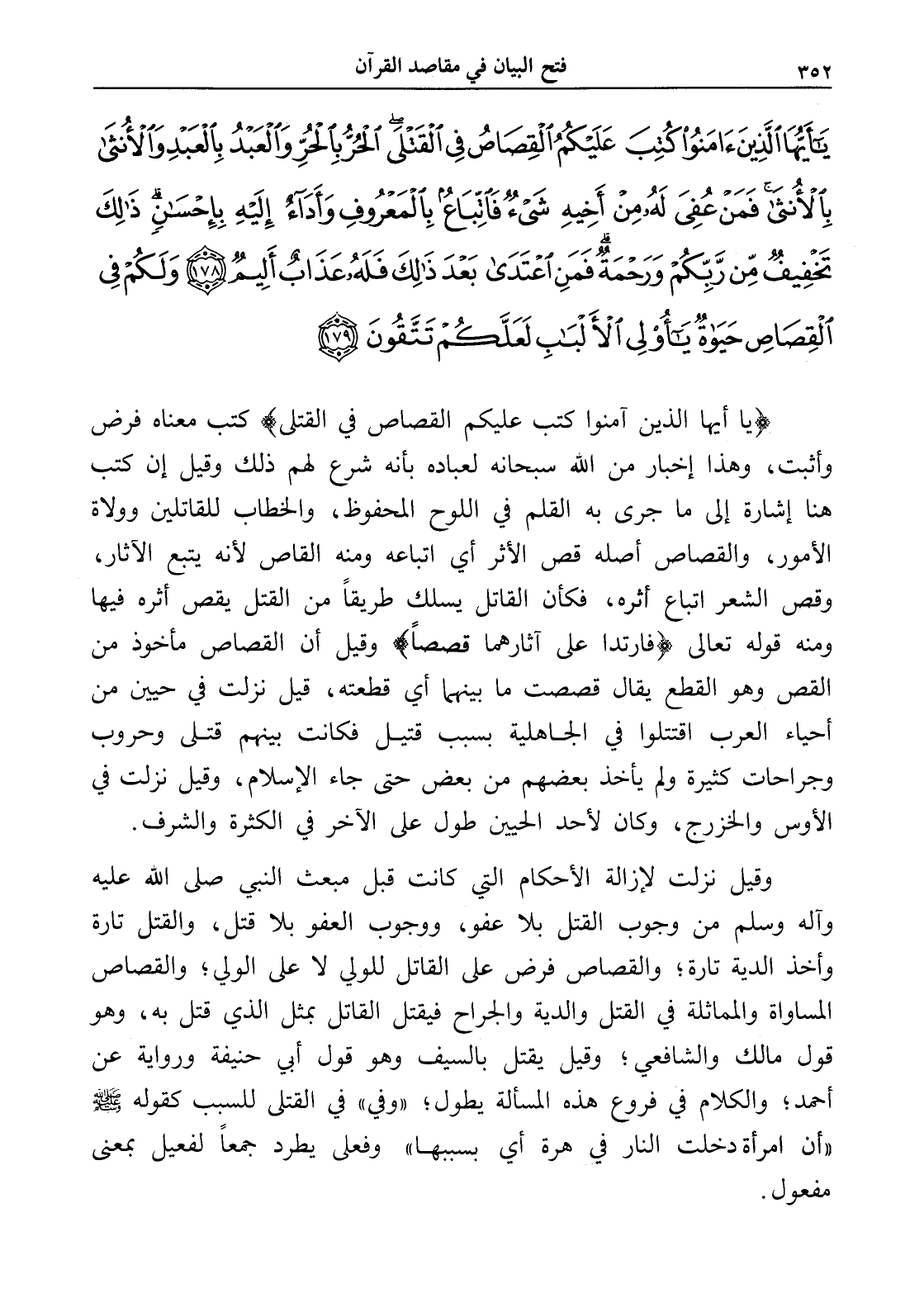 (يا أيها الذين آمنوا كتب عليكم القصاص في القتلى) كتب معناه فرض وأثبت، وهذا إخبار من الله سبحانه لعباده بأنه شرع لهم ذلك وقيل إن كتب هنا إشارة إلى ما جرى به القلم في اللوح المحفوظ، والخطاب للقاتلين وولاة الأمور، والقصاص أصله قص الأثر أي اتباعه ومنه القاص لأنه يتبع الآثار، وقص الشعر اتباع أثره، فكأن القاتل يسلك طريقاً من القتل يقص أثره فيها ومنه قوله تعالى (فارتدا على آثارهما قصصاً) وقيل أن القصاص مأخوذ من القص وهو القطع يقال قصصت ما بينهما أي قطعته، قيل نزلت في حيين من أحياء العرب اقتتلوا في الجاهلية بسبب قتيل فكانت بينهم قتلى وحروب وجراحات كثيرة ولم يأخذ بعضهم من بعض حتى جاء الإسلام، وقيل نزلت في الأوس والخزرج، وكان لأحد الحيين طول على الآخر في الكثرة والشرف.
