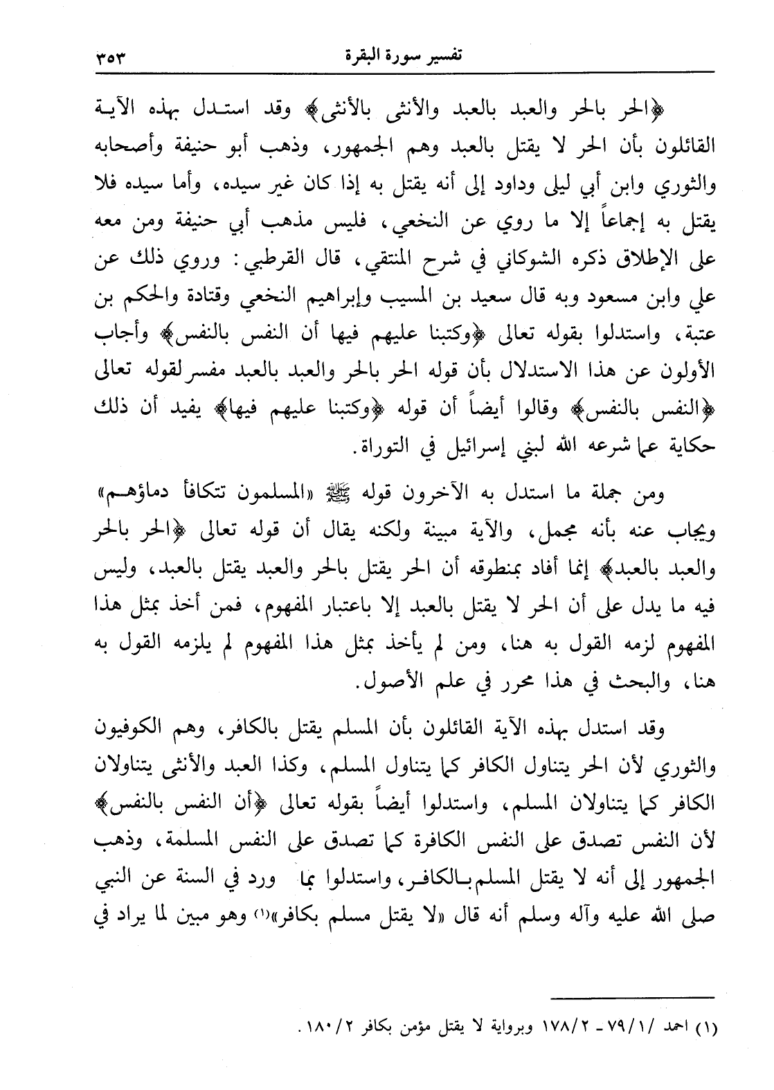 (الحر بالحر والعبد بالعبد والأنثى بالأنثى) وقد استدل بهذه الآية القائلون بأن الحر لا يقتل بالعبد وهم الجمهور، وذهب أبو حنيفة وأصحابه والثوري وابن أبي ليلى وداود إلى أنه يقتل به إذا كان غير سيده، وأما سيده فلا يقتل به إجماعاً إلا ما روي عن النخعي، فليس مذهب أبي حنيفة ومن معه على الإطلاق ذكره الشوكاني في شرح المنتقي، قال القرطبي: وروي ذلك عن علي وابن مسعود وبه قال سعيد بن المسيب وإبراهيم النخعي وقتادة والحكم بن عتبة، واستدلوا بقوله تعالى (وكتبنا عليهم فيها أن النفس بالنفس) وأجاب الأولون عن هذا الاستدلال بأن قوله الحر بالحر والعبد بالعبد مفسر لقوله تعالى (النفس بالنفس) وقالوا أيضاً أن قوله (وكتبنا عليهم فيها) يفيد أن ذلك حكاية عما شرعه الله لبني إسرائيل في التوراة.