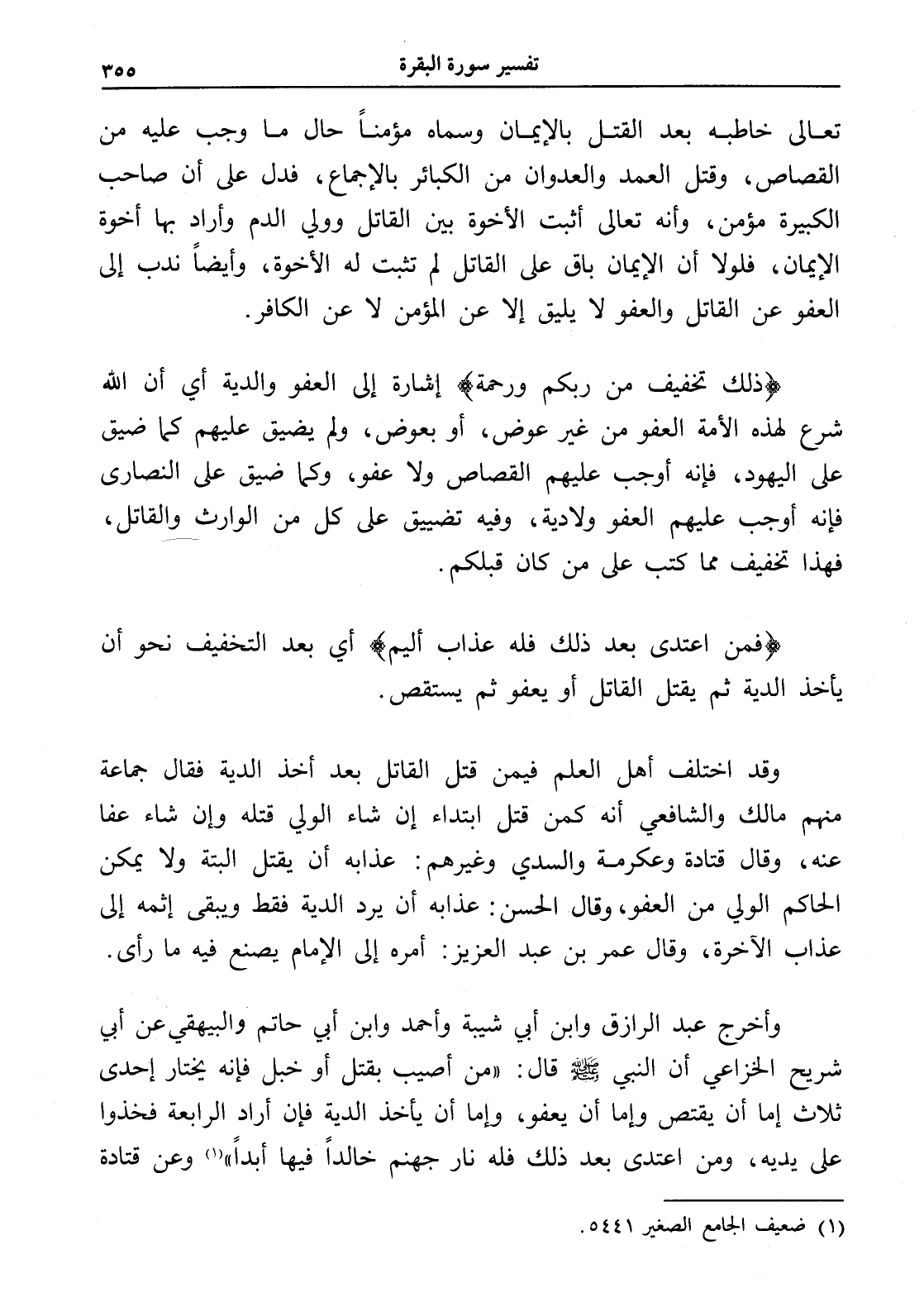 (ذلك تخفيف من ربكم ورحمة) إشارة إلى العفو والدية أي أن الله شرع لهذه الأمة العفو من غير عوض، أو بعوض، ولم يضيق عليهم كما ضيق على اليهود، فإنه أوجب عليهم القصاص ولا عفو، وكما ضيق على النصارى فإنه أوجب عليهم العفو ولادية، وفيه تضييق على كل من الوارث والقاتل، فهذا تخفيف مما كتب على من كان قبلكم.