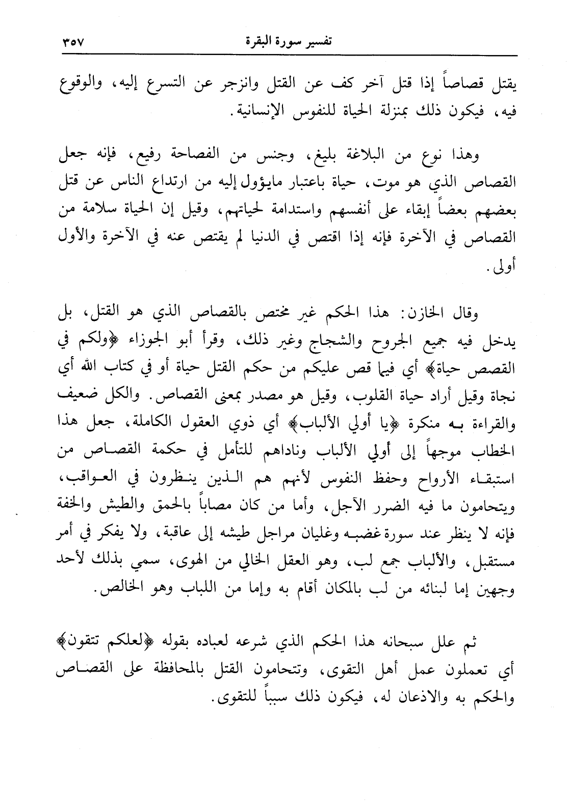 وقال الخازن: هذا الحكم غير مختص القصاص الذي هو القتل، بل يدخل فيه جميع الجروح والشجاج وغير ذلك، وقرأ أبو الجوزاء (ولكم في القصص حياة) أي فيما قص عليكم من حكم القتل حياة أو في كتاب الله أي نجاة وقيل أراد حياة القلوب، وقيل هو مصدر بمعنى القصاص. والكل ضعيف والقراءة به منكرة (يا أولي الألباب) أي ذوي العقول الكاملة، جعل هذا الخطاب موجهاً إلى أولي الألباب وناداهم للتأمل في حكمة القصاص من استبقاء الأرواح وحفظ النفوس لأنهم هم الذين ينظرون في العواقب، ويتحامون ما فيه الضرر الآجل، وأما من كان مصاباً بالحمق والطيش والخفة فإنه لا ينظر عند سورة غضبه وغليان مراجل طيشه إلى عاقبة، ولا يفكر في أمر مستقبل، والألباب جمع لب، وهو العقل الخالي من الهوى، سمي بذلك لأحد وجهين إما لبنائه من لب بالمكان أقام به وإما من اللباب وهو الخالص.
