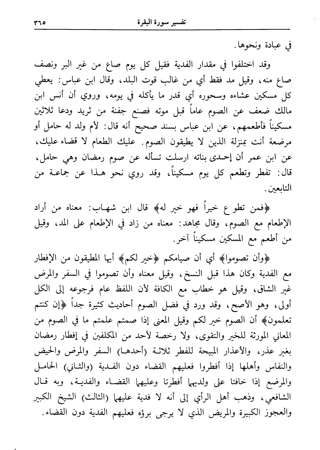وقد اختلفوا في مقدار الفدية فقيل كل يوم صاع من غير البر ونصف صاع منه، وقيل مد فقط أي من غالب قوت البلد، وقال ابن عباس: يعطي كل مسكين عشاءه وسحوره أي قدر ما يأكله في يومه، وروي أن أنس ابن مالك ضعف عن الصوم عاماً قبل موته فصنع جفنة من ثريد ودعا ثلاثين مسكيناً فأطعمهم، عن ابن عباس بسند صحيح أنه قال: لأم ولد له حامل أو مرضعة أنت بمنزلة الذين لا يطيقون الصوم. عليك الطعام لا قضاء عليك، عن ابن عمر أن إحدى بناته أرسلت تسأله عن صوم رمضان وهي حامل، قال: تفطر وتطعم كل يوم مسكيناً، وقد روي نحو هذا عن جماعة من التابعين.
