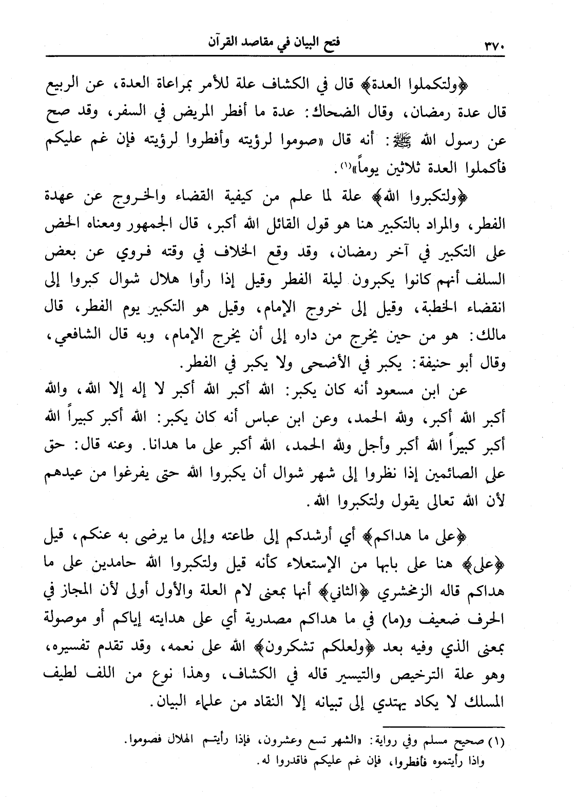 (ولتكبروا الله) علة لما علم من كيفية القضاء والخروج عن عهدة الفطر، والمراد بالتكبير هنا هو قول القائل الله أكبر، قال الجمهور ومعناه الحض على التكبير في آخر رمضان، وقد وقع الخلاف في وقته فروي عن بعض السلف أنهم كانوا يكبرون ليلة الفطر وقيل إذا رأوا هلال شوال كبروا إلى انقضاء الخطبة، وقيل إلى خروج الإمام، وقيل هو التكبير يوم الفطر، قال مالك: هو من حين يخرج من داره إلى أن يخرج الإمام، وبه قال الشافعي، وقال أبو حنيفة: يكبر في الأضحى ولا يكبر في الفطر.