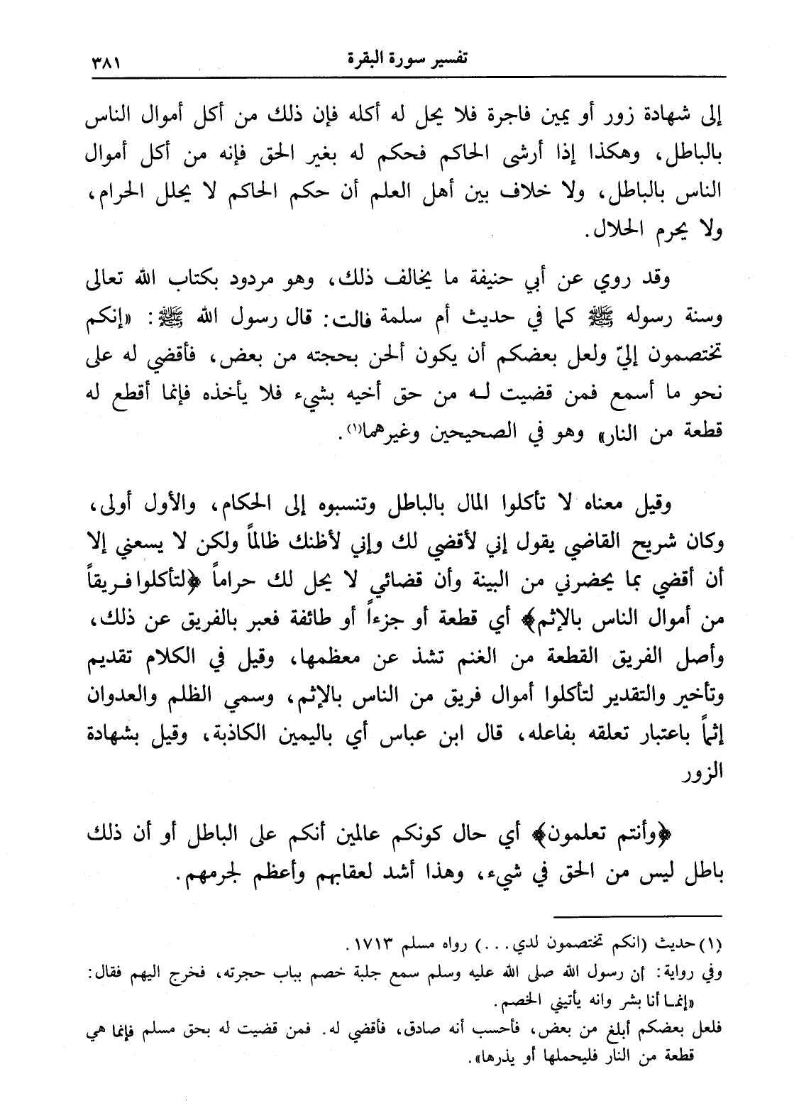 وقيل معناه لا تأكلوا المال بالباطل وتنسبوه إلى الحكام، والأول أولى، وكان شريح القاضي يقول إني لأقضي لك وإني لأظنك ظالماً ولكن لا يسعني إلا أن أقضي بما يحضرني من البينة وأن قضائى لا يحل لك حراماً (لتأكلوا فريقاً من أموال الناس بالإثم) أي قطعة أو جزءاً أو طائفة فعبر بالفريق عن ذلك، وأصل الفريق القطعة من الغنم تشذ عن معظمها، وقيل في الكلام تقديم وتأخير والتقدير لتأكلوا أموال فريق من الناس بالإثم، وسمي الظلم والعدوان إثماً باعتبار تعلقه بفاعله، قال ابن عباس أي باليمين الكاذبة، وقيل بشهادة الزور.