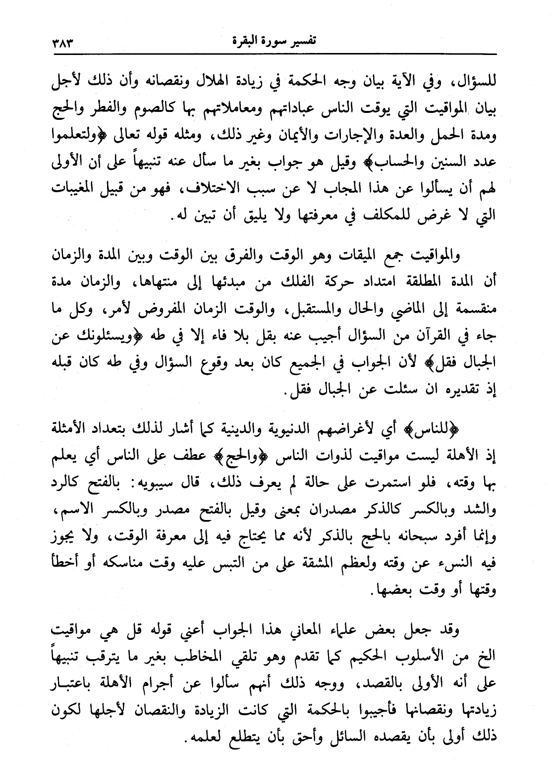 والمواقيت جمع الميقات وهو الوقت والفرق بين الوقت وبين المدة والزمان أن المدة المطلقة امتداد حركة الفلك من مبدئها إلى منتهاها، والزمان مدة منقسمة إلى الماضي والحال والمستقبل، والوقت الزمان المفروض لأمر، وكل ما جاء في القرآن من السؤال أجيب عنه بقل بلا فاء إلا في طه (ويسئلونك عن الجبال فقل) لأن الجواب في الجميع كان بعد وقوع السؤال وفي طه كان قبله إذ تقديره إن سئلت عن الجبال فقل.