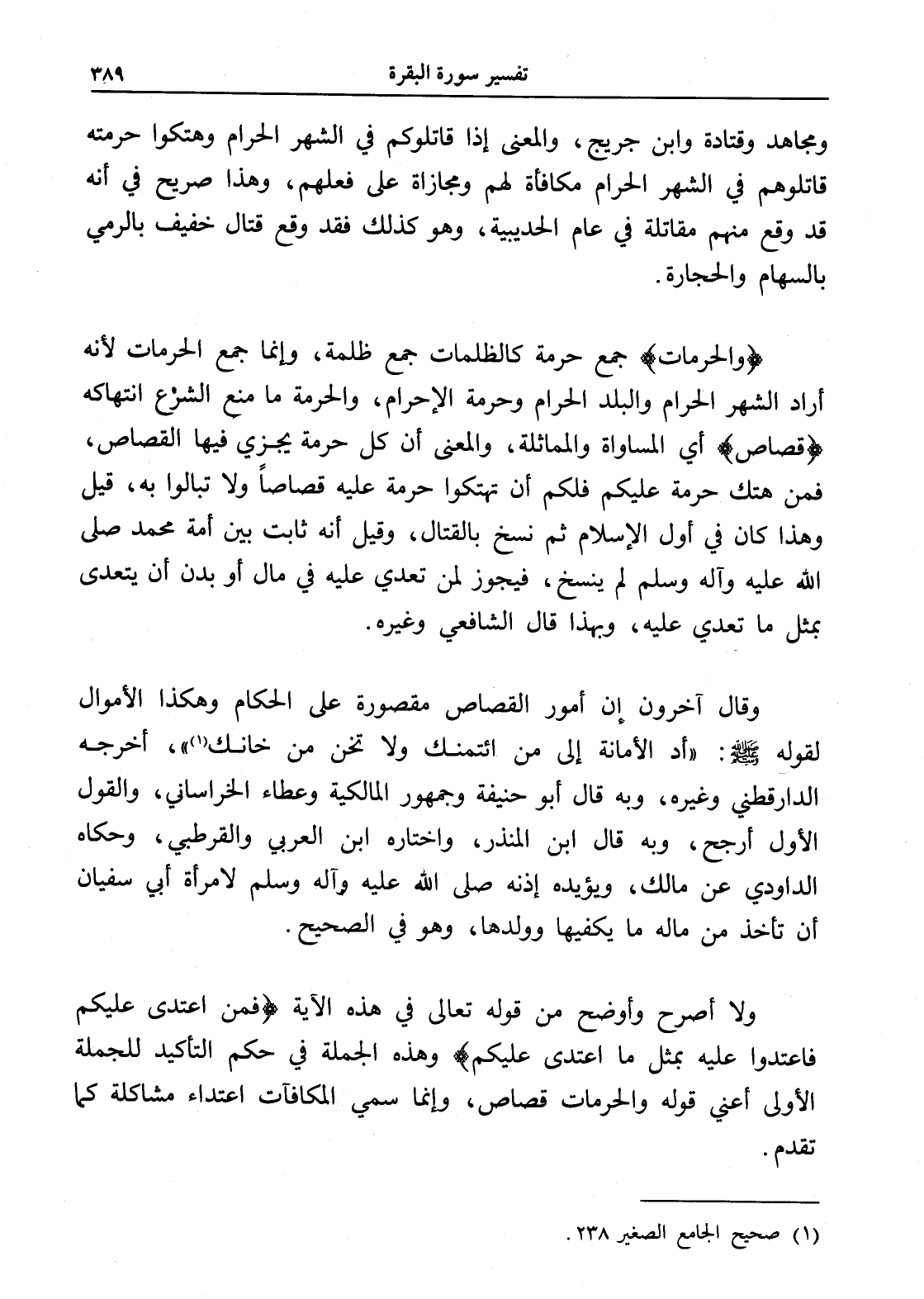 ولا أصرح وأوضح من قوله تعالى في هذه الآية (فمن اعتدى عليكم فاعتدوا عليه بمثل ما اعتدى عليكم) وهذه الجملة في حكم التأكيد للجملة الأولى أعني قوله والحرمات قصاص، وإنما سمي المكافآت اعتداء مشاكلة كما تقدم.