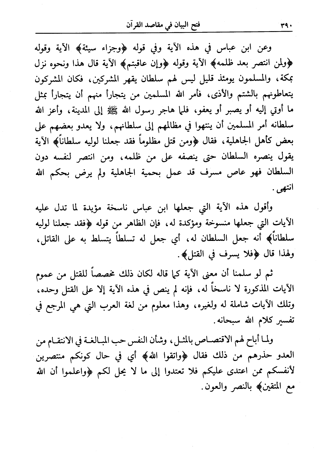 وأقول هذه الآية التي جعلها ابن عباس ناسخة مؤيدة لما تدل عليه الآيات التي جعلها منسوخة ومؤكدة له، فإن الظاهر من قوله (فقد جعلنا لوليه سلطاناً) أنه جعل السلطان له، أي جعل له تسلطاً يتسلط به على القاتل، ولهذا قال (فلا يسرف في القتل).