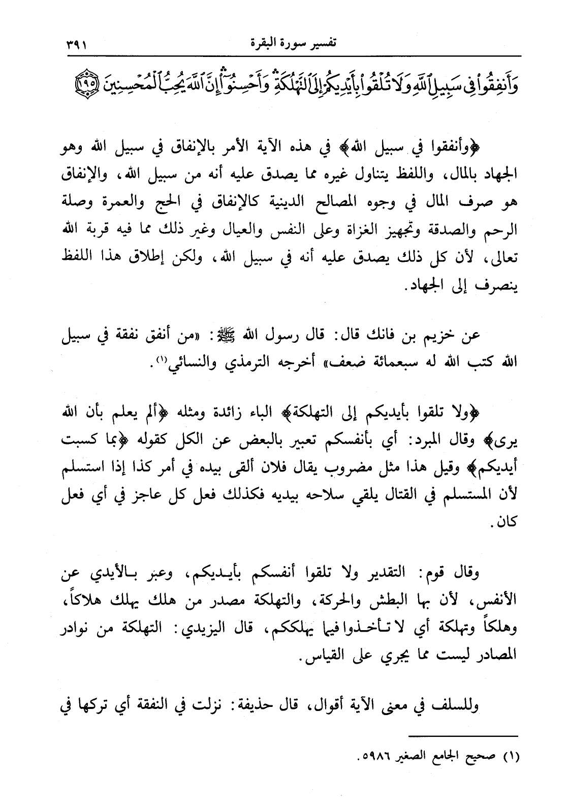 وَأَنْفِقُوا فِي سَبِيلِ اللَّهِ وَلَا تُلْقُوا بِأَيْدِيكُمْ إِلَى التَّهْلُكَةِ وَأَحْسِنُوا إِنَّ اللَّهَ يُحِبُّ الْمُحْسِنِينَ (195)