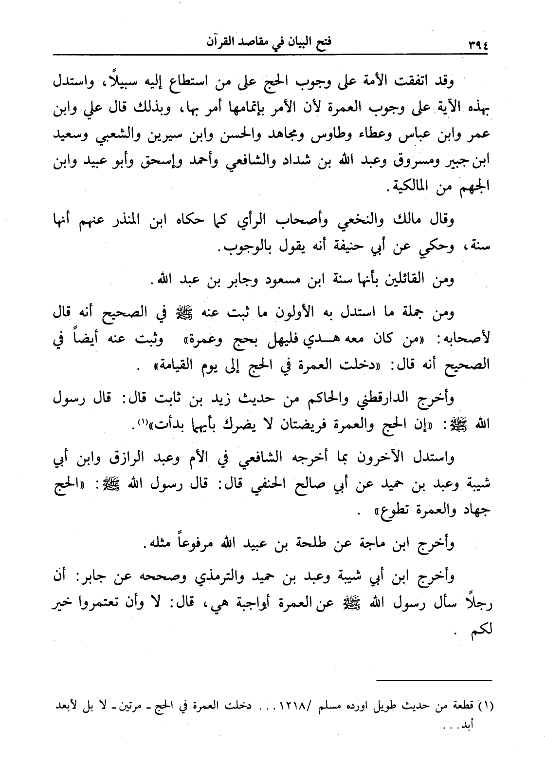 وقد اتفقت الأمة على وجوب الحج على من استطاع إليه سبيلاً، واستدل بهذه الآية على وجوب العمرة لأن الأمر بإتمامها أمر بها، وبذلك قال علي وابن عمر وابن عباس وعطاء وطاوس ومجاهد والحسن وابن سيرين والشعبي وسعيد ابن جبير ومسروق وعبد الله بن شداد والشافعي وأحمد وإسحق وأبو عبيد وابن الجهم من المالكية.