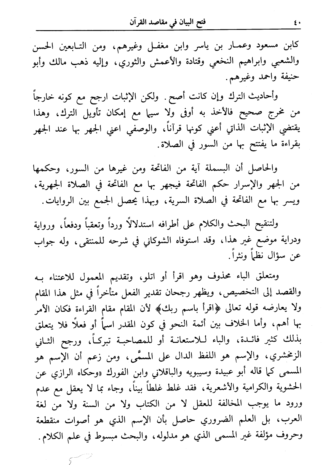 وأحاديث الترك وإن كانت أصح. ولكن الإثبات أرجح مع كونه خارجاً من مخرج صحيح فالأخذ به أوفى ولا سيما مع إمكان تأويل الترك، وهذا يقتضي الإثبات الذاتي أعني كونها قرآناً، والوصفي أعني الجهر بها عند الجهر بقراءة ما يفتتح بها من السور في الصلاة.