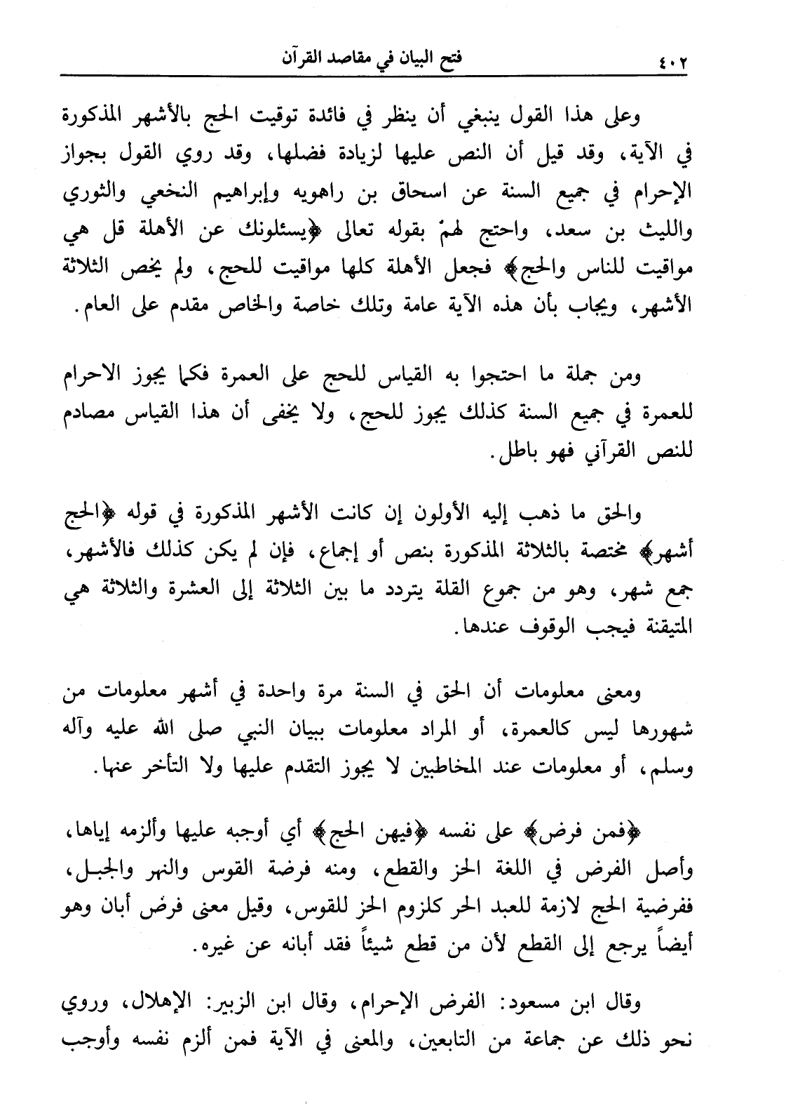 ومن جملة ما احتجوا به القياس للحج على العمرة فكما يجوز الإحرام للعمرة في جميع السنة كذلك يجوز للحج، ولا يخفى أن هذا القياس مصادم للنص القرآني فهو باطل.
