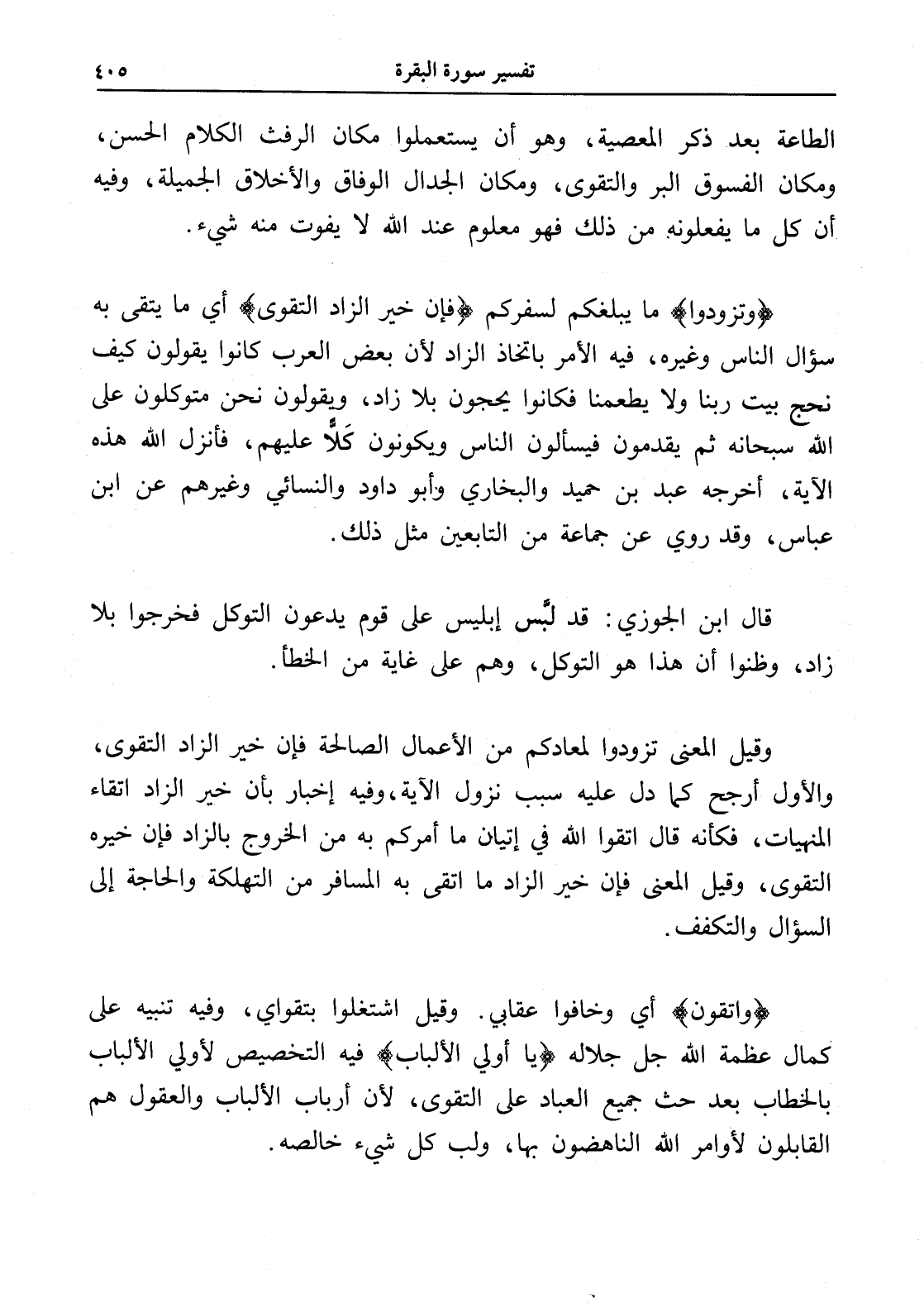 وقيل المعنى تزودوا لمعادكم من الأعمال الصالحة فإن خير الزاد التقوى، والأول أرجح كما دل عليه سبب نزول الآية، وفيه إخبار بأن خير الزاد اتقاء المنهيات، فكأنه قال اتقوا الله في إتيان ما أمركم به من الخروج بالزاد فإن خيره التقوى، وقيل المعنى فإن خير الزاد ما اتقى به المسافر من التهلكة والحاجة إلى السؤال والتكفف.