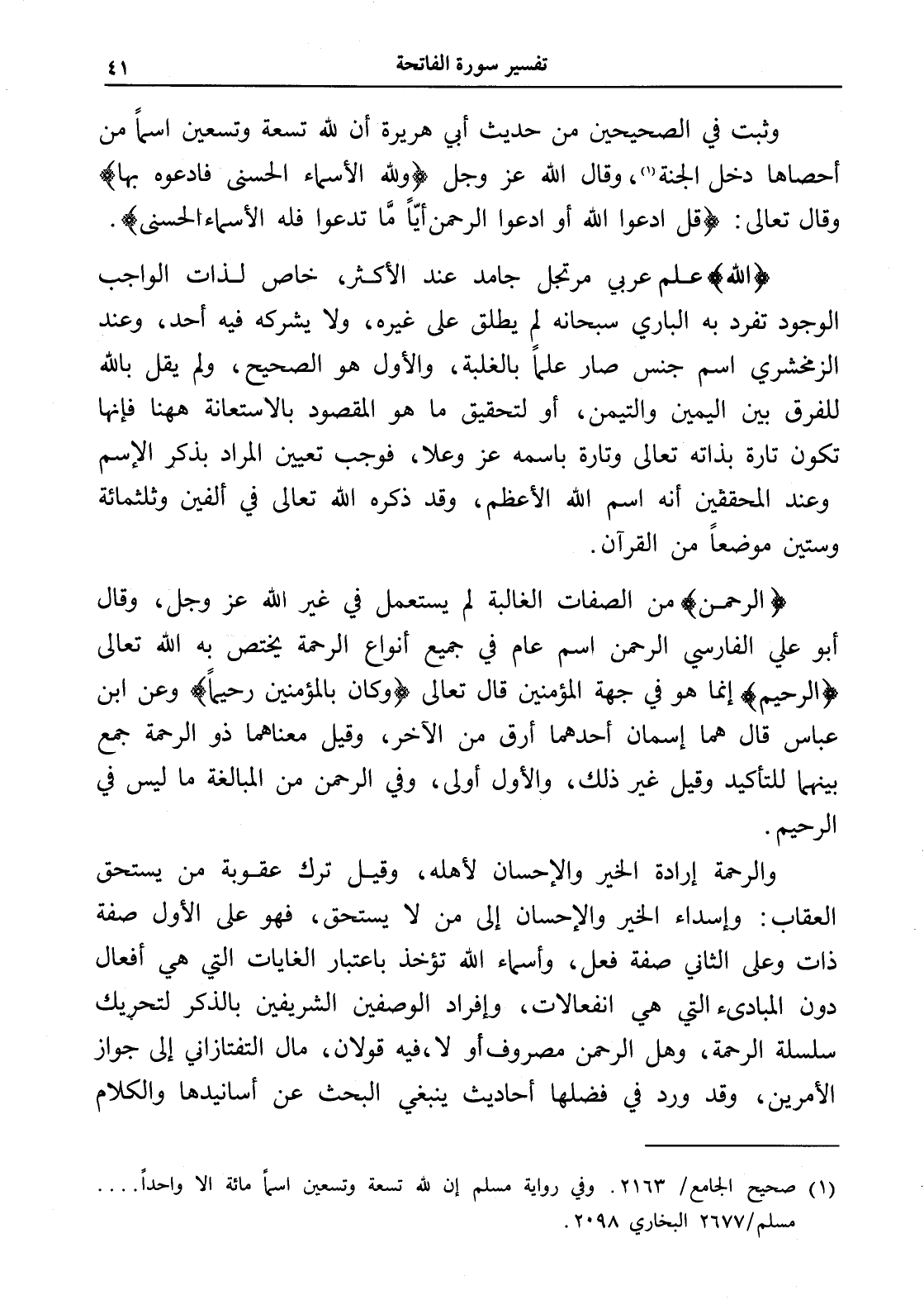 والرحمة إرادة الخير والإحسان لأهله، وقيل ترك عقوبة من يستحق العقاب: وإسداء الخير والإحسان إلى من لا يستحق، فهو على الأول صفة ذات وعلى الثاني صفة فعل، وأسماء الله تؤخذ باعتبار الغايات التي هي أفعال دون المبادىء التي هي انفعالات، وإفراد الوصفين الشريفين بالذكر لتحريك سلسلة الرحمة، وهل الرحمن مصروف أو لا، فيه قولان، مال التفتازاني إلى جواز الأمرين، وقد ورد في فضلها أحاديث ينبغي البحث عن أسانيدها والكلام