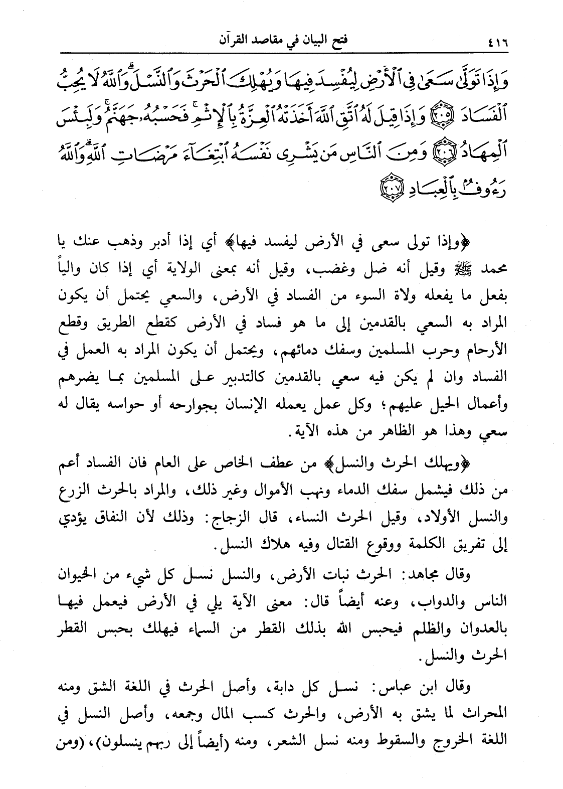 وقال مجاهد: الحرث نبات الأرض، والنسل نسل كل شيء من الحيوان الناس والدواب، وعنه أيضاً قال: معنى الآية يلي في الأرض فيعمل فيها بالعدوان والظلم فيحبس الله بذلك القطر من السماء فيهلك بحبس القطر الحرث والنسل.