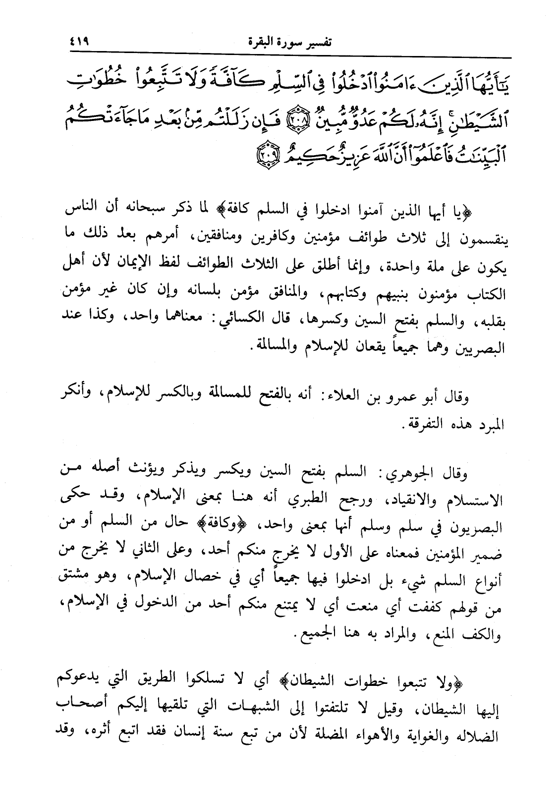 يَا أَيُّهَا الَّذِينَ آَمَنُوا ادْخُلُوا فِي السِّلْمِ كَافَّةً وَلَا تَتَّبِعُوا خُطُوَاتِ الشَّيْطَانِ إِنَّهُ لَكُمْ عَدُوٌّ مُبِينٌ (208) فَإِنْ زَلَلْتُمْ مِنْ بَعْدِ مَا جَاءَتْكُمُ الْبَيِّنَاتُ فَاعْلَمُوا أَنَّ اللَّهَ عَزِيزٌ حَكِيمٌ (209)
