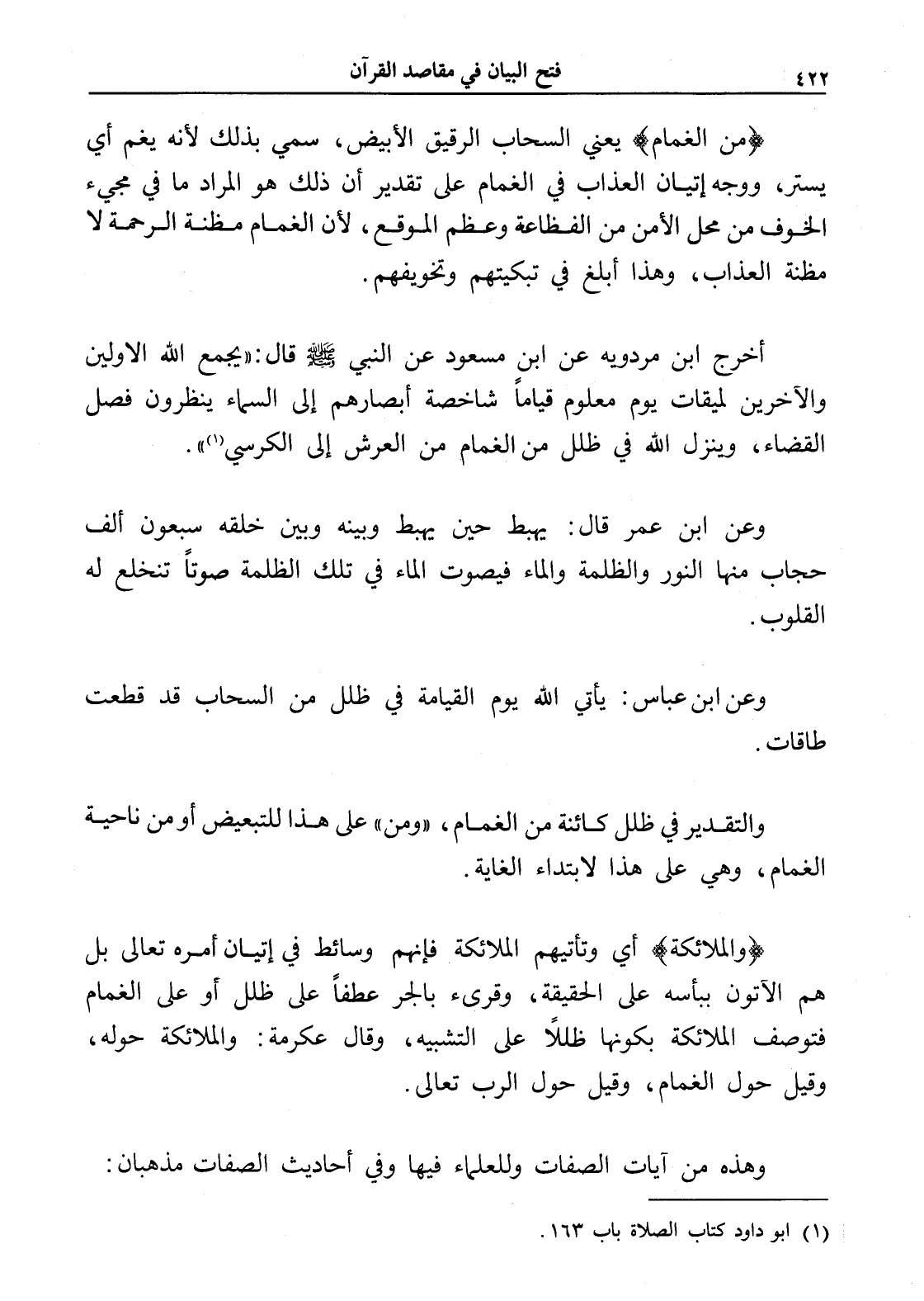 وعن ابن عباس: يأتي الله يوم القيامة في ظلل من السحاب قد قطعت طاقات.