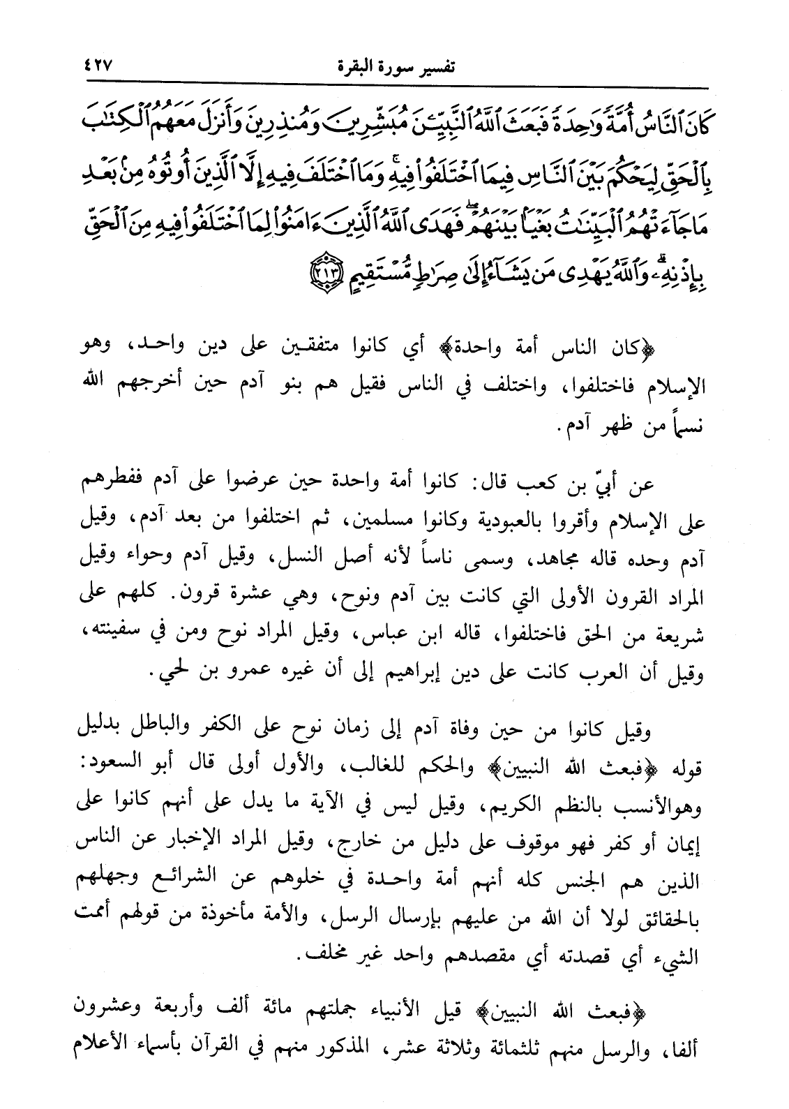 كَانَ النَّاسُ أُمَّةً وَاحِدَةً فَبَعَثَ اللَّهُ النَّبِيِّينَ مُبَشِّرِينَ وَمُنْذِرِينَ وَأَنْزَلَ مَعَهُمُ الْكِتَابَ بِالْحَقِّ لِيَحْكُمَ بَيْنَ النَّاسِ فِيمَا اخْتَلَفُوا فِيهِ وَمَا اخْتَلَفَ فِيهِ إِلَّا الَّذِينَ أُوتُوهُ مِنْ بَعْدِ مَا جَاءَتْهُمُ الْبَيِّنَاتُ بَغْيًا بَيْنَهُمْ فَهَدَى اللَّهُ الَّذِينَ آَمَنُوا لِمَا اخْتَلَفُوا فِيهِ مِنَ الْحَقِّ بِإِذْنِهِ وَاللَّهُ يَهْدِي مَنْ يَشَاءُ إِلَى صِرَاطٍ مُسْتَقِيمٍ (213)