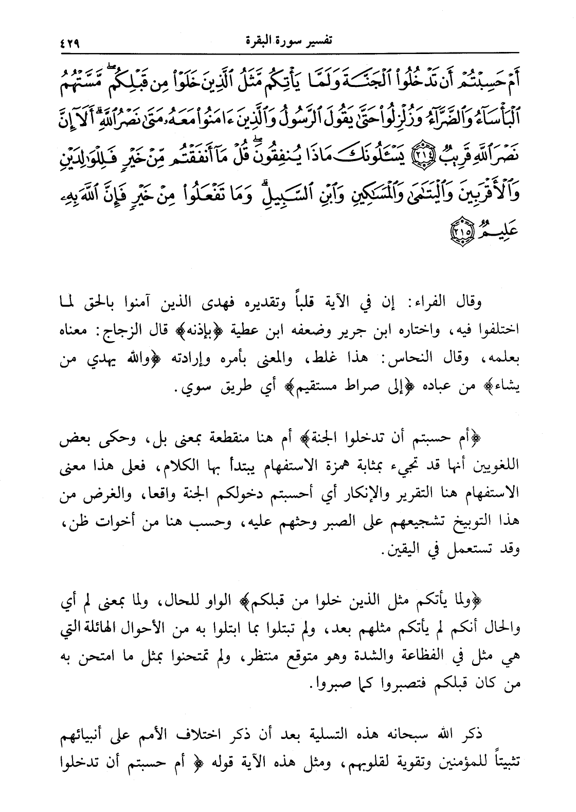 أَمْ حَسِبْتُمْ أَنْ تَدْخُلُوا الْجَنَّةَ وَلَمَّا يَأْتِكُمْ مَثَلُ الَّذِينَ خَلَوْا مِنْ قَبْلِكُمْ مَسَّتْهُمُ الْبَأْسَاءُ وَالضَّرَّاءُ وَزُلْزِلُوا حَتَّى يَقُولَ الرَّسُولُ وَالَّذِينَ آَمَنُوا مَعَهُ مَتَى نَصْرُ اللَّهِ أَلَا إِنَّ نَصْرَ اللَّهِ قَرِيبٌ (214) يَسْأَلُونَكَ مَاذَا يُنْفِقُونَ قُلْ مَا أَنْفَقْتُمْ مِنْ خَيْرٍ فَلِلْوَالِدَيْنِ وَالْأَقْرَبِينَ وَالْيَتَامَى وَالْمَسَاكِينِ وَابْنِ السَّبِيلِ وَمَا تَفْعَلُوا مِنْ خَيْرٍ فَإِنَّ اللَّهَ بِهِ عَلِيمٌ (215)