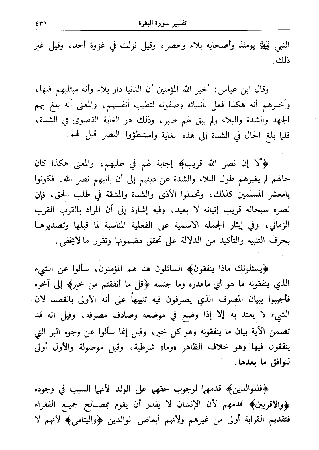 (يسئلونك ماذا ينفقون) السائلون هنا هم المؤمنون، سألوا عن الشيء الذي ينفقونه ما هو أي ما قدره وما جنسه (قل ما أنفقتم من خير) إلى آخره فأجيبوا ببيان المصرف الذي يصرفون فيه تنبيهاً على أنه الأولى بالقصد لأن الشيء لا يعتد به إلا إذا وضع في موضعه وصادف مصرفه، وقيل أنه قد تضمن الآية بيان ما ينفقونه وهو كل خير، وقيل إنما سألوا عن وجوه البر التي ينفقون فيها وهو خلاف الظاهر " وما " شرطية، وقيل موصولة والأول أولى لتوافق ما بعدها.