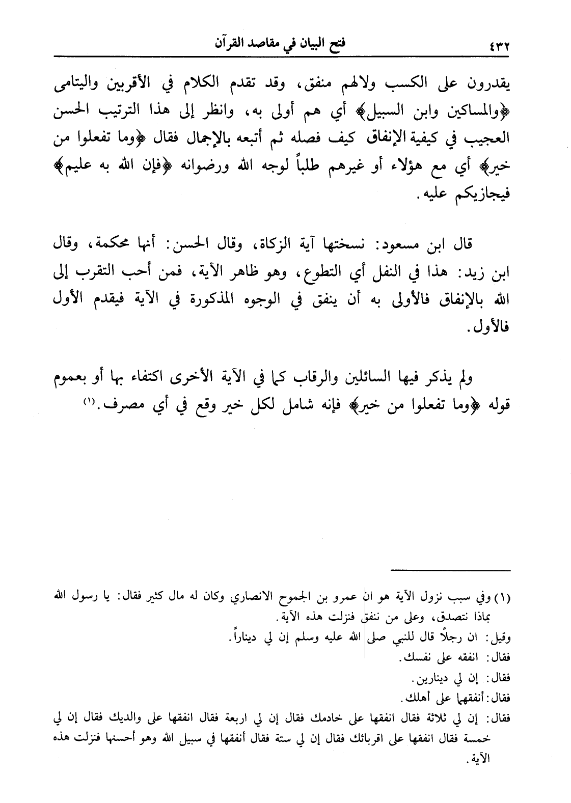قال ابن مسعود: نسختها آية الزكاة، وقال الحسن: أنها محكمة، وقال ابن زيد: هذا في النفل أي التطوع، وهو ظاهر الآية، فمن أحب التقرب إلى الله بالإنفاق فالأولى به أن ينفق في الوجوه المذكورة في الآية فيقدم الأول فالأول.