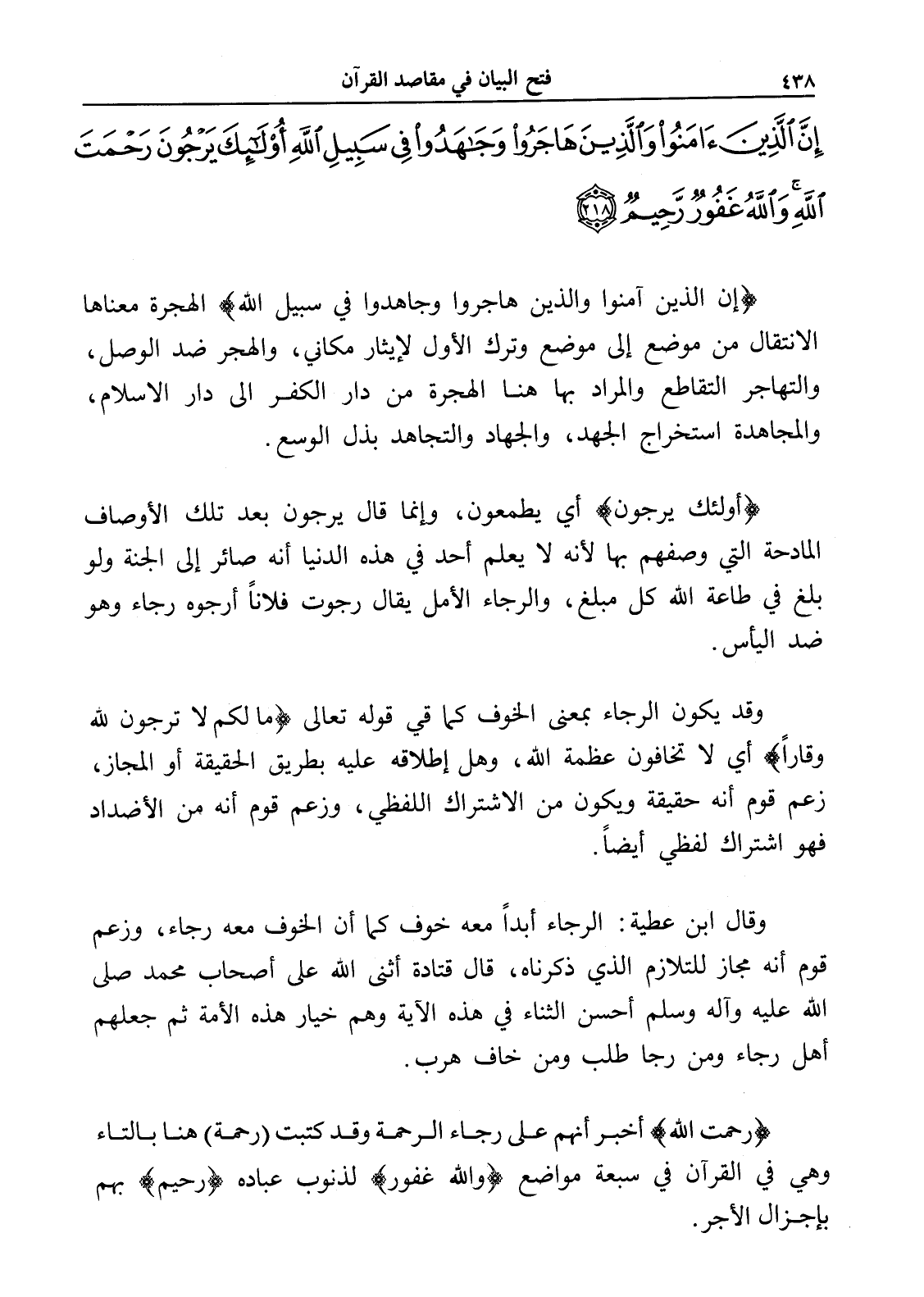 إِنَّ الَّذِينَ آَمَنُوا وَالَّذِينَ هَاجَرُوا وَجَاهَدُوا فِي سَبِيلِ اللَّهِ أُولَئِكَ يَرْجُونَ رَحْمَةَ اللَّهِ وَاللَّهُ غَفُورٌ رَحِيمٌ (218)