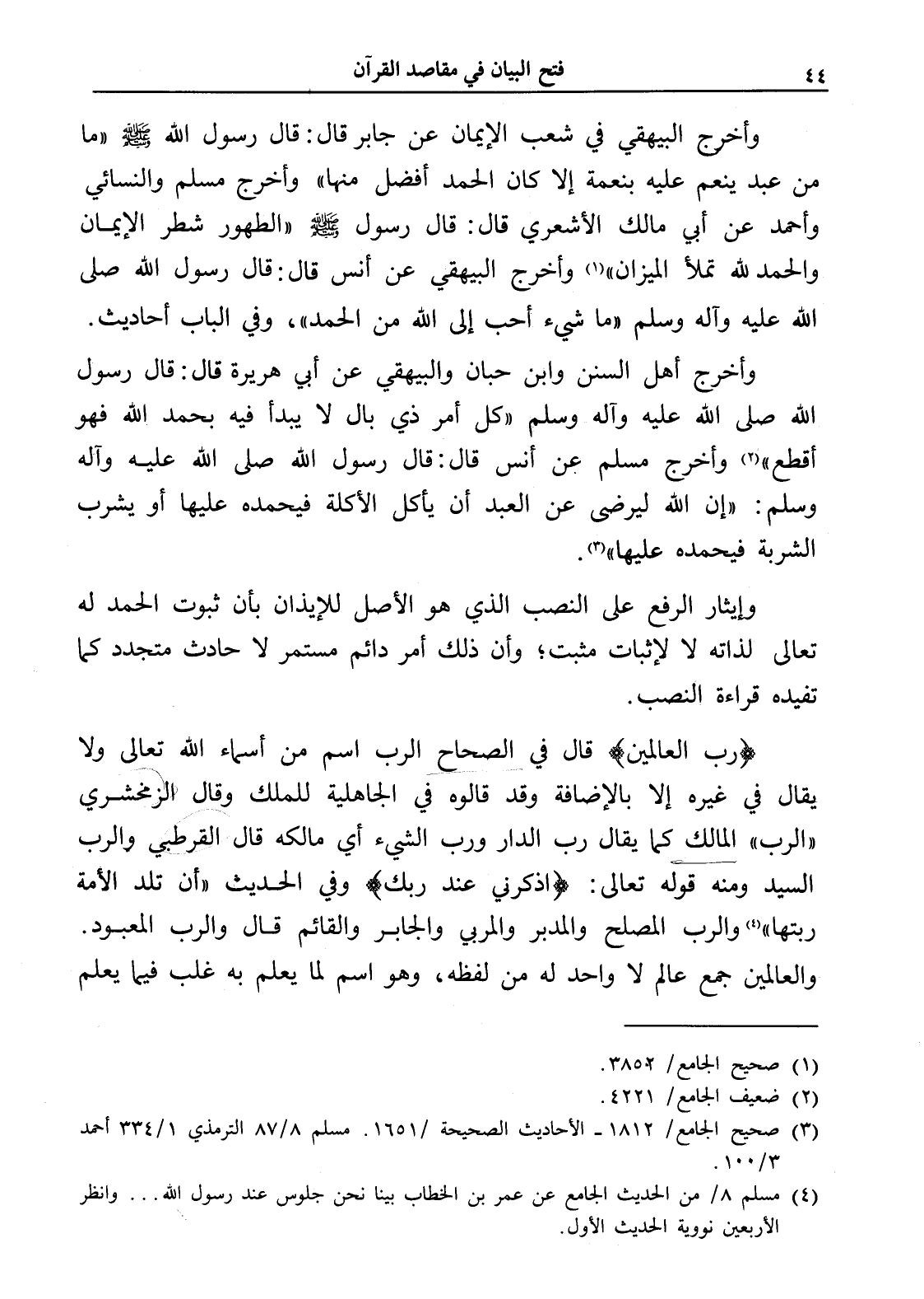 وأخرج البيهقي في شعب الإيمان عن جابر قال: قال رسول الله - صلى الله عليه وسلم - " ما من عبد ينعم عليه بنعمة إلا كان الحمد أفضل منها " وأخرج مسلم والنسائي وأحمد عن أبي مالك الأشعري قال: قال رسول - صلى الله عليه وسلم - " الطهور شطر الإيمان والحمد لله تملأ الميزان " (¬1) وأخرج البيهقي عن أنس قال: قال رسول الله صلى الله عليه وآله وسلم " ما شيء أحب إلى الله من الحمد "، وفي الباب أحاديث.