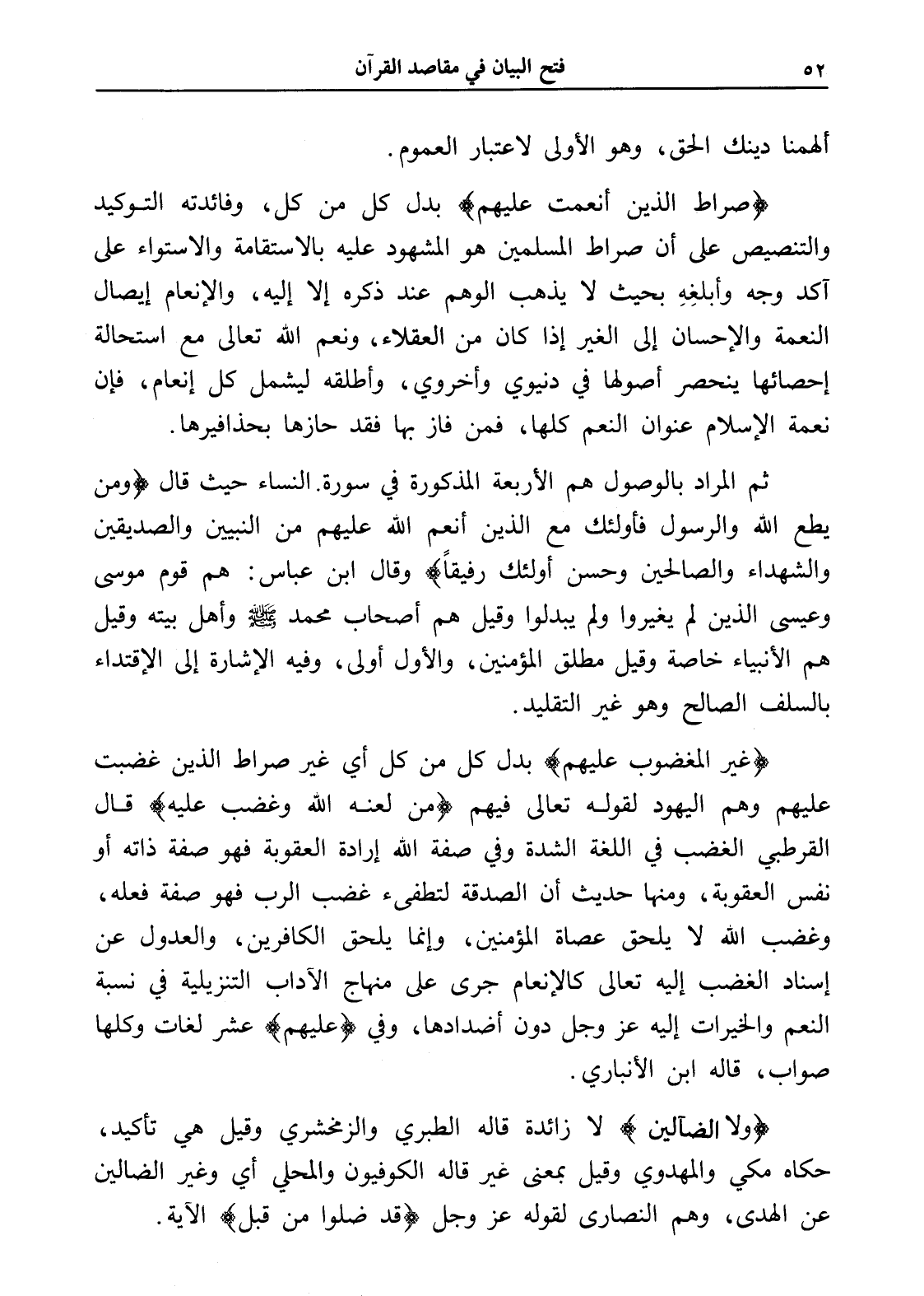 (صراط الذين أنعمت عليهم) بدل كل من كل، وفائدته التوكيد والتنصيص على أن صراط المسلمين هو المشهود عليه بالاستقامة والاستواء على آكد وجه وأبلغِهِ بحيث لا يذهب الوهم عند ذكره إلا إليه، والإنعام إيصال النعمة والإحسان إلى الغير إذا كان من العقلاء، ونعم الله تعالى مع استحالة إحصائها ينحصر أصولها في دنيوي وأخروي، وأطلقه ليشمل كل إنعام، فإن نعمة الإسلام عنوان النعم كلها، فمن فاز بها فقد حازها بحذافيرها.