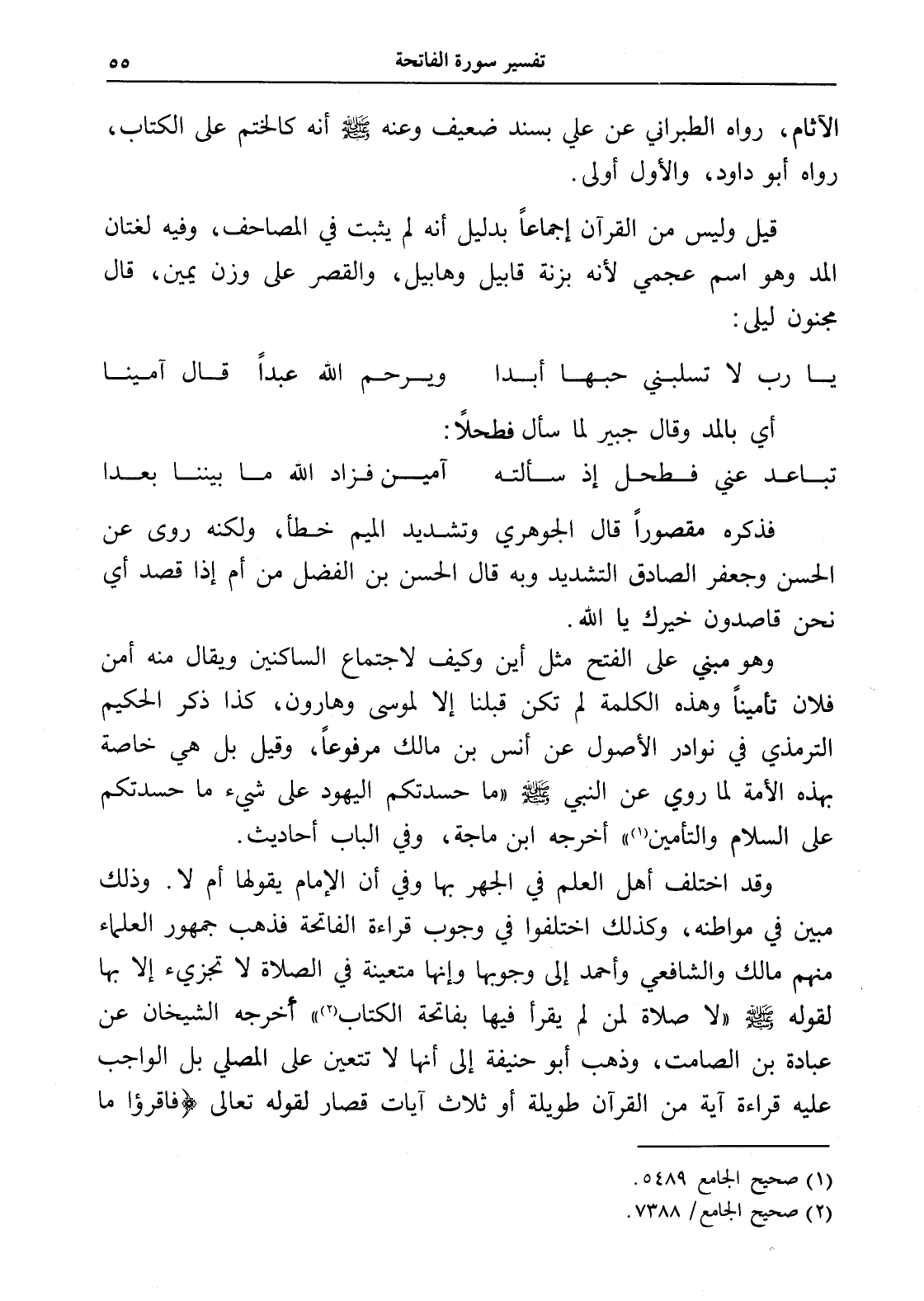 وقد اختلف أهل العلم في الجهر بها وفي أن الإمام يقولها أم لا. وذلك مبين في مواطنه، وكذلك اختلفوا في وجوب قراءة الفاتحة فذهب جمهور العلماء منهم مالك والشافعي وأحمد إلى وجوبها وإنها متعينة في الصلاة لا تجزيء إلا بها لقوله - صلى الله عليه وسلم - " لا صلاة لمن لم يقرأ فيها بفاتحة الكتاب (¬2) " أخرجه الشيخان عن عبادة بن الصامت، وذهب أبو حنيفة إلى أنها لا تتعين على المصلي بل الواجب عليه قراءة آية من القرآن طويلة أو ثلاث آيات قصار لقوله تعالى (فاقرؤا ما