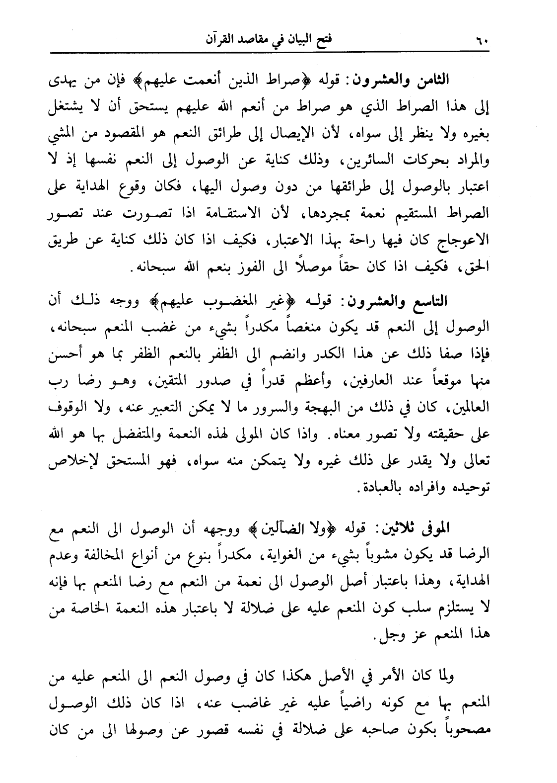 الموفى ثلاثين: قوله (ولا الضآلين) ووجهه أن الوصول إلى النعم مع الرضا قد يكون مشوباً بشيء من الغواية، مكدراً بنوع من أنواع المخالفة وعدم الهداية، وهذا باعتبار أصل الوصول إلى نعمة من النعم مع رضا المنعم بها فإنه لا يستلزم سلب كون المنعم عليه على ضلالة لا باعتبار هذه النعمة الخاصة من هذا المنعم عز وجل.