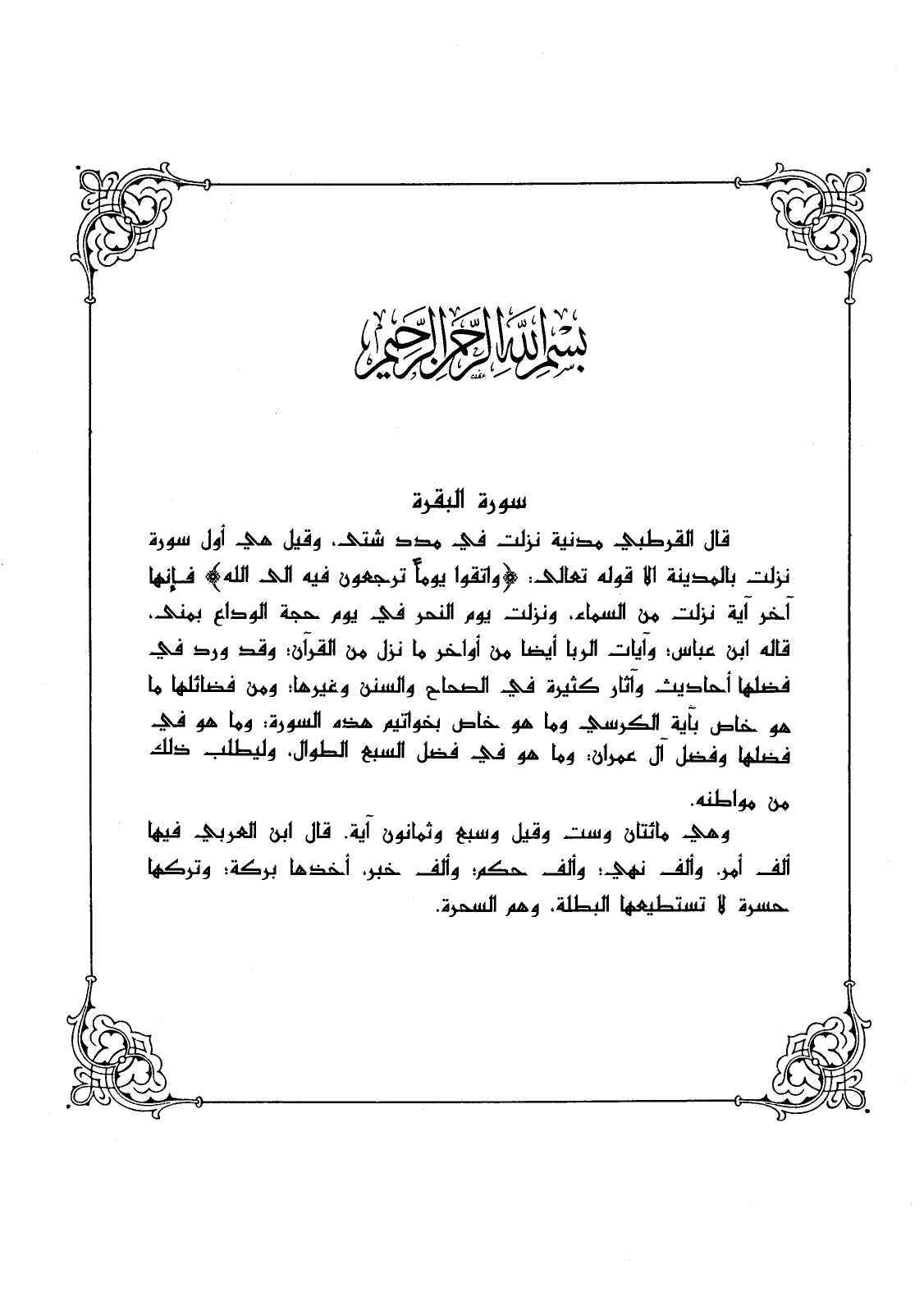 قال القرطبي مدنية نزلت في مدد شتى، وقيل هي أول سورة نزلت بالمدينة الا قوله تعالى: (واتقوا يوماً ترجعون فيه إلى الله) فإنها آخر آية نزلت من السماء. ونزلت يوم النحر في يوم حجة الوداع بمنى، قاله ابن عباس: وآيات الربا أيضاً من أواخر ما نزل من القرآن؛ وقد ورد في فضلها أحاديث وآثار كثيرة في الصحاح والسنن وغيرها؛ ومن فضائلها ما هو خاص بآية الكرسي وما هو خاص بخواتيم هذه السورة: وما هو في فضلها وفضل آل عمران: وما هو في فضل السبع الطوال، وليطلب ذلك من مواطنه.