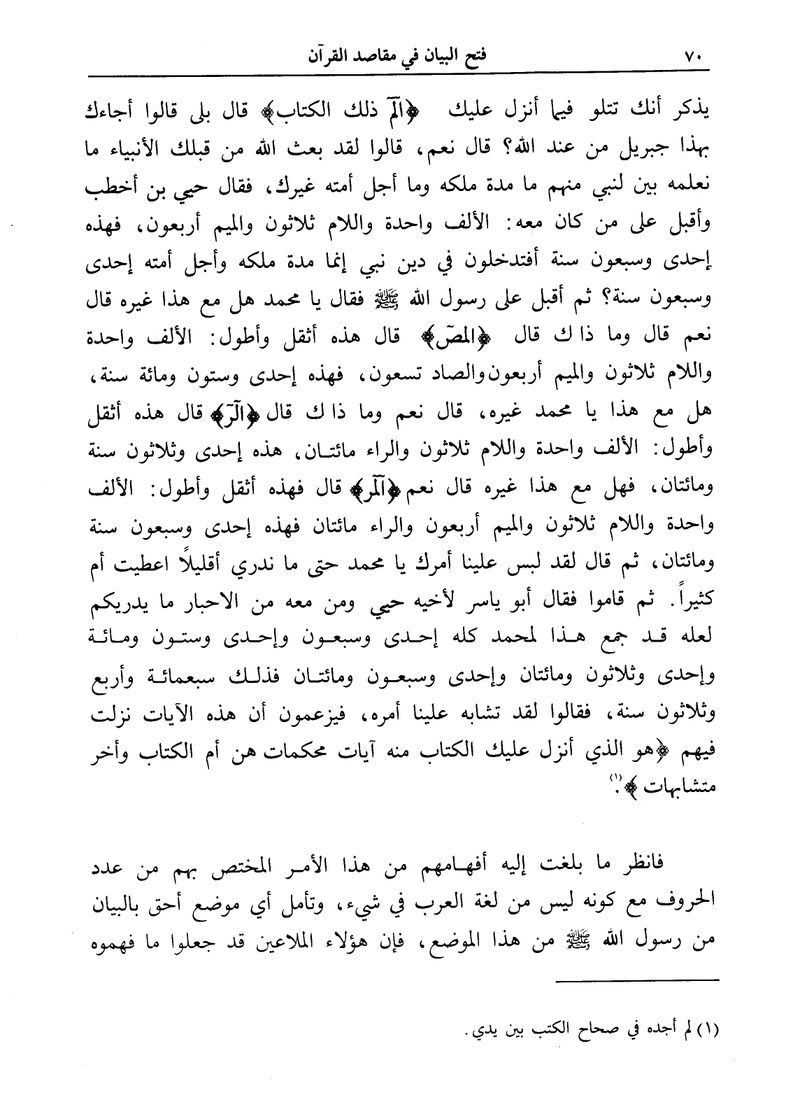 يذكر أنك تتلو فيما أنزل عليك (آلم ذلك الكتاب) قال بلى قالوا أجاءك بهذا جبريل من عند الله؟ قال نعم، قالوا لقد بعث الله من قبلك الأنبياء ما نعلمه بين لنبي منهم ما مدة ملكه وما أجل أمته غيرك، فقال حيي بن أخطب وأقبل على من كان معه: الألف واحدة واللام ثلاثون والميم أربعون، فهذه إحدى وسبعون سنة أفتدخلون في دين نبي إنما مدة ملكه وأجل أمته إحدى وسبعون سنة؟ ثم أقبل على رسول الله - صلى الله عليه وسلم - فقال يا محمد هل مع هذا غيره قال نعم قال وما ذاك قال (المصَ) قال هذه أثقل وأطول: الألف واحدة واللام ثلاثون والميم أربعون والصاد تسعون، فهذه إحدى وستون ومائة سنة، هل مع هذا يا محمد غيره، قال نعم وما ذاك قال (الر) قال هذه أثقل وأطول: الألف واحدة واللام ثلاثون والراء مائتان، هذه إحدى وثلاثون سنة ومائتان، فهل مع هذا غيره قال نعم (آلمر) قال فهذه أثقل وأطول: الألف واحدة واللام ثلاثون والميم أربعون والراء مائتان فهذه إحدى وسبعون سنة ومائتان، ثم قال لقد لبس علينا أمرك يا محمد حتى ما ندري أقليلاً أعطيت أم كثيراً. ثم قاموا فقال أبو ياسر لأخيه حيي ومن معه من الأحبار ما يدريكم لعله قد جمع هذا لمحمد كله إحدى وسبعون وإحدى وستون ومائة وإحدى وثلاثون ومائتان وإحدى وسبعون ومائتان فذلك سبعمائة وأربع وثلاثون سنة، فقالوا لقد تشابه علينا أمره، فيزعمون أن هذه الآيات نزلت فيهم (هو الذي أنزل عليك الكتاب منه آيات محكمات هن أم الكتاب وأخر متشابهات) (¬1).