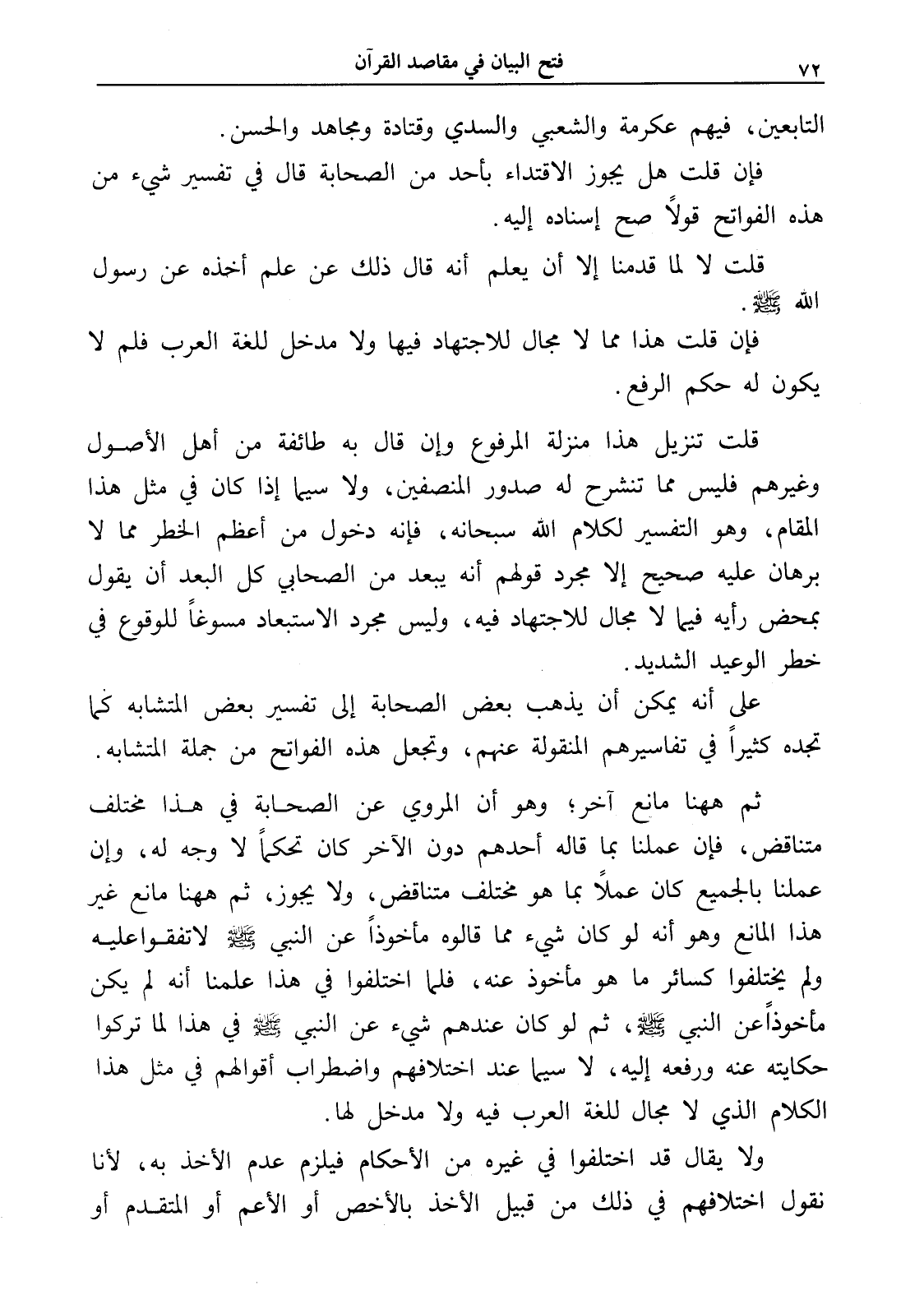 فإن قلت هل يجوز الاقتداء بأحد من الصحابة قال في تفسير شيء من هذه الفواتح قولاً صح إسناده إليه.
